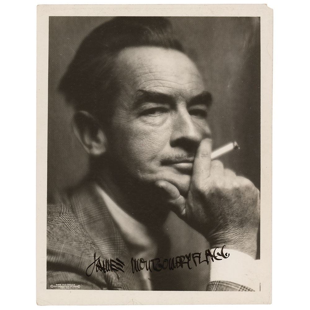 Vintage glossy 8 x 10 photo of Flagg with cigarette in hand, taken by prolific NYC portrait photographer Pirie MacDonald, boldly signed in thick ink, "James Montgomery Flagg." Reverse bears a National Broadcasting Corporation stamp. In fine condition, with scattered light creasing, some light silvering, and a missing upper right corner tip.