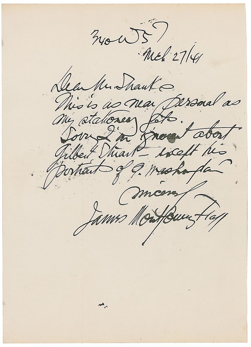 ALS, one page, 8 x 11, March 27, 1941. Letter to Mr. Shanks. In full: “This is as near personal as my stationery gets. Sorry I’m ignorant about Gilbert Stuart—except his portrait of G. Washington.” In fine condition, with intersecting folds, two through single letters of signature, and a few ink blots and marks from Flagg’s bold pen.