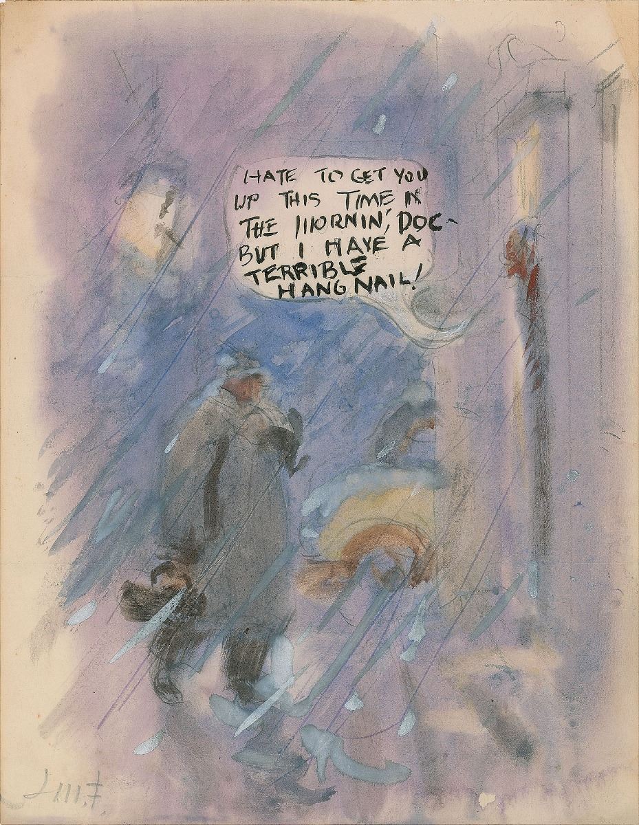 Fantastic original pencil, ink, and watercolor sketch on an off-white 8.25 x 10.75 sheet, depicting a doctor making a house call during a blizzard, his prospective patient speaking from a lit doorway, “Hate to get you up this time in the mornin,’ Doc—but I have a terrible hangnail!” Signed in the lower left in pencil, “JMF.” In fine condition. A humorous sketch from the sought-after illustrator.