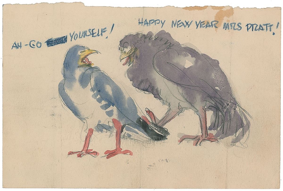 Sought-after unsigned original pencil and watercolor sketch on an off-white 8.5 x 5.75 sheet, depicting two pigeons in conversation, captioned in pencil with dialogue, “Happy New Year Mrs. Pratt!” and “Ah—Go….yourself!” In fine condition, with three vertical folds and light staining to top edge. An unusual and delightful sketch from the adored illustrator.