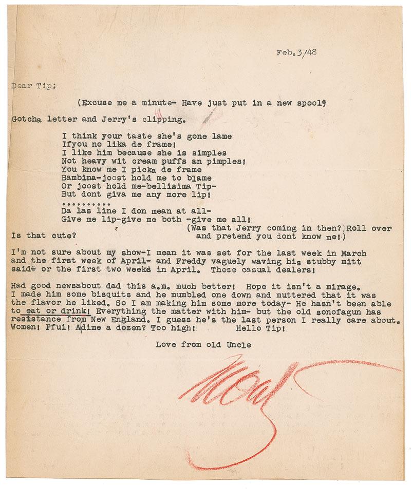 American artist and illustrator (1877–1960) best known for his iconic image of Uncle Sam saying ‘I Want You’ on a World War I recruiting poster. TLS signed “Monty,” one page, 8 x 9.5, February 3, 1948. Humorous correspondence, partly written as a poem, addressed to “Tip.” In full, the unedited text reads: “(Excuse me a minute—Have just put in a new spool.) Gotcha letter and Jerry’s clipping. I think you taste she’s gone lame, If you no lika da frame! I like him because she is simples, Not heavy wit cream puffs an pimples! You know me I picka da frame, Bambina—joost hold me to blame; Or joost hold me—bellisima Tip—But dont giva me any more lip! Da las line I don mean at all—Give me lip—give me both—give me all! (Was that Jerry coming in then? Roll over and pretend you dont know me!) Is that cute?