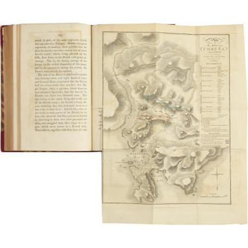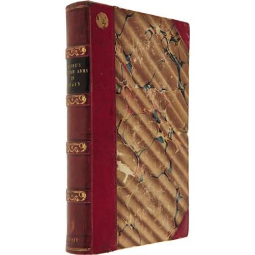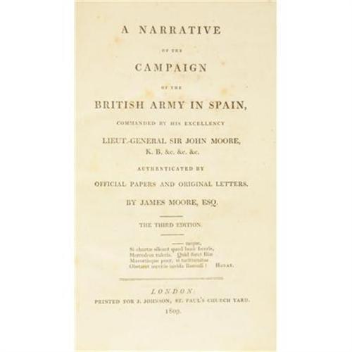 <B>James Moore. </B></I><B><I>A Narrative of the Campaign of the British Army in Spain, Commanded By His Excellency Lieut.-General Sir John Moore, K.B. &c. &c. &c. Authenticated By Official Papers And Original Letters.</B></I></B></I> London: Joseph Johnson., 1809.<BR><BR>Octavo. xix, 388, 136 pages. 2 folding engraved maps. Very small loss of text pages 365-368.<BR>Contemporary half calf over marbled boards. Gilt spine with black Morocco label. Binding lightly worn. Professional restoration to spine. A very good copy.<BR><BR>Edited by Sir John Moore's brother and comprises correspondence and narration about the campaign. Illustrations include plans of the action near Corunna; Spain and Portugal with the march of the British columns, and a view of the British and French positions before Corunna.<BR><BR><BR><b>Shipping:</b> Books & Catalogs (<a target="_blank" href="http://www.heritageauctions.com/common/shipping.php">view shipping information</a>)