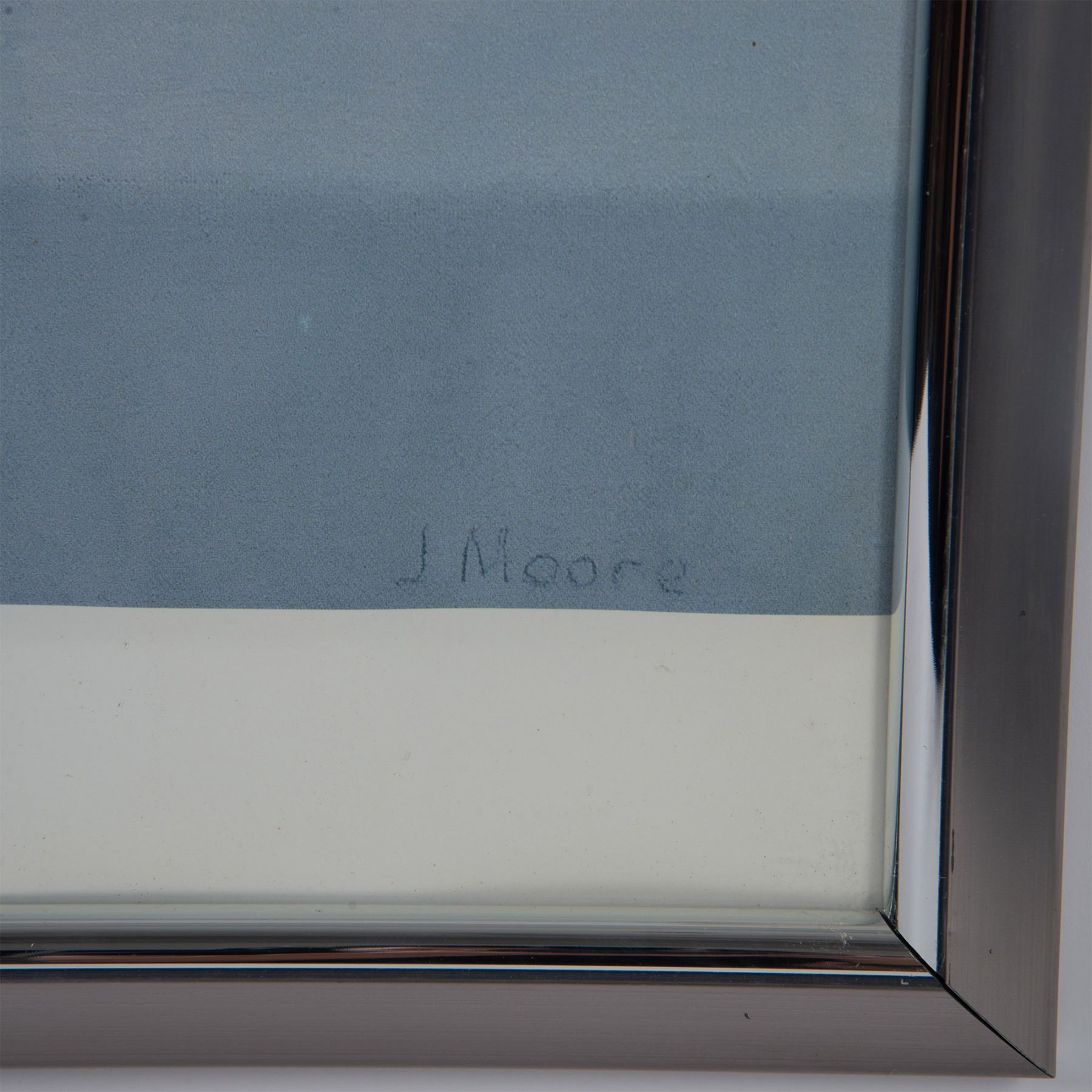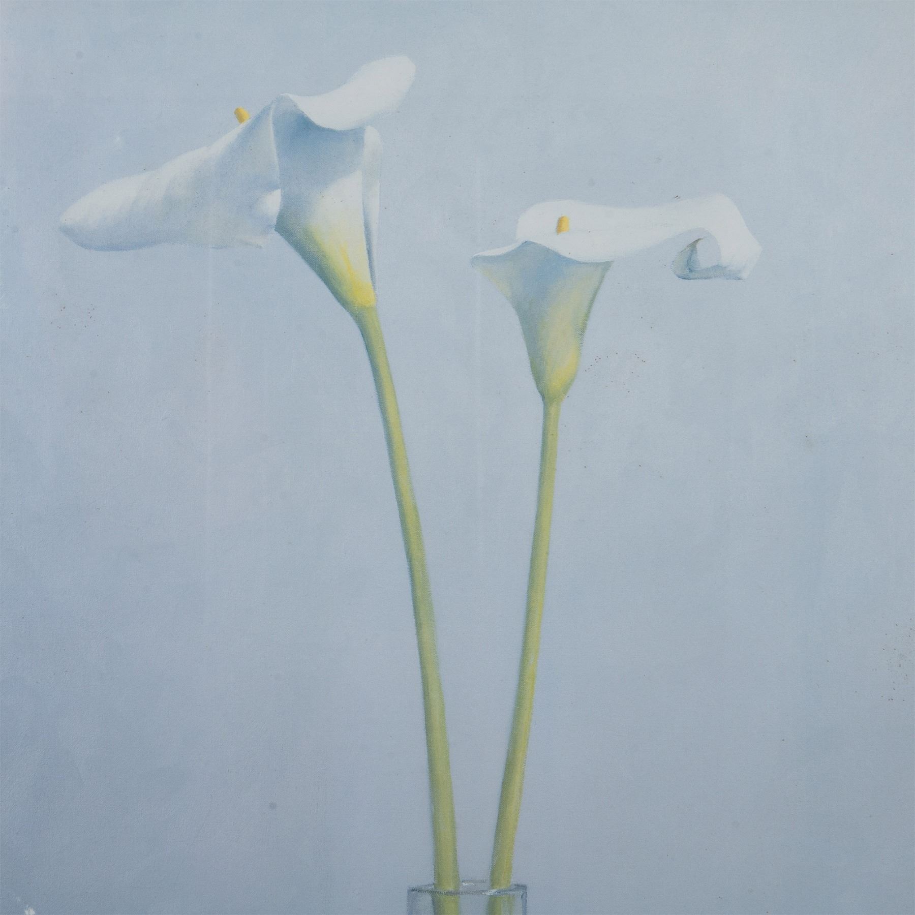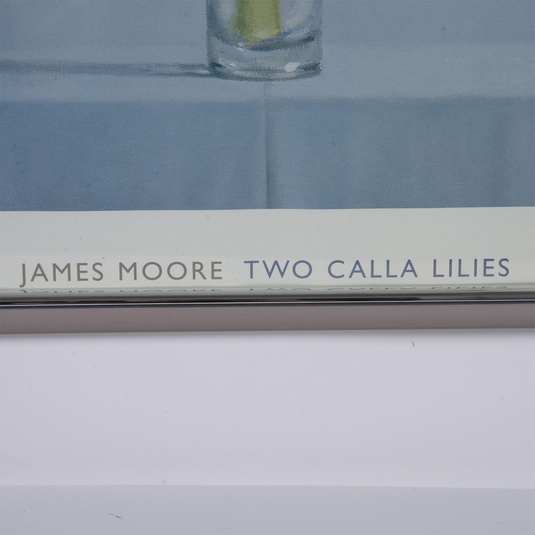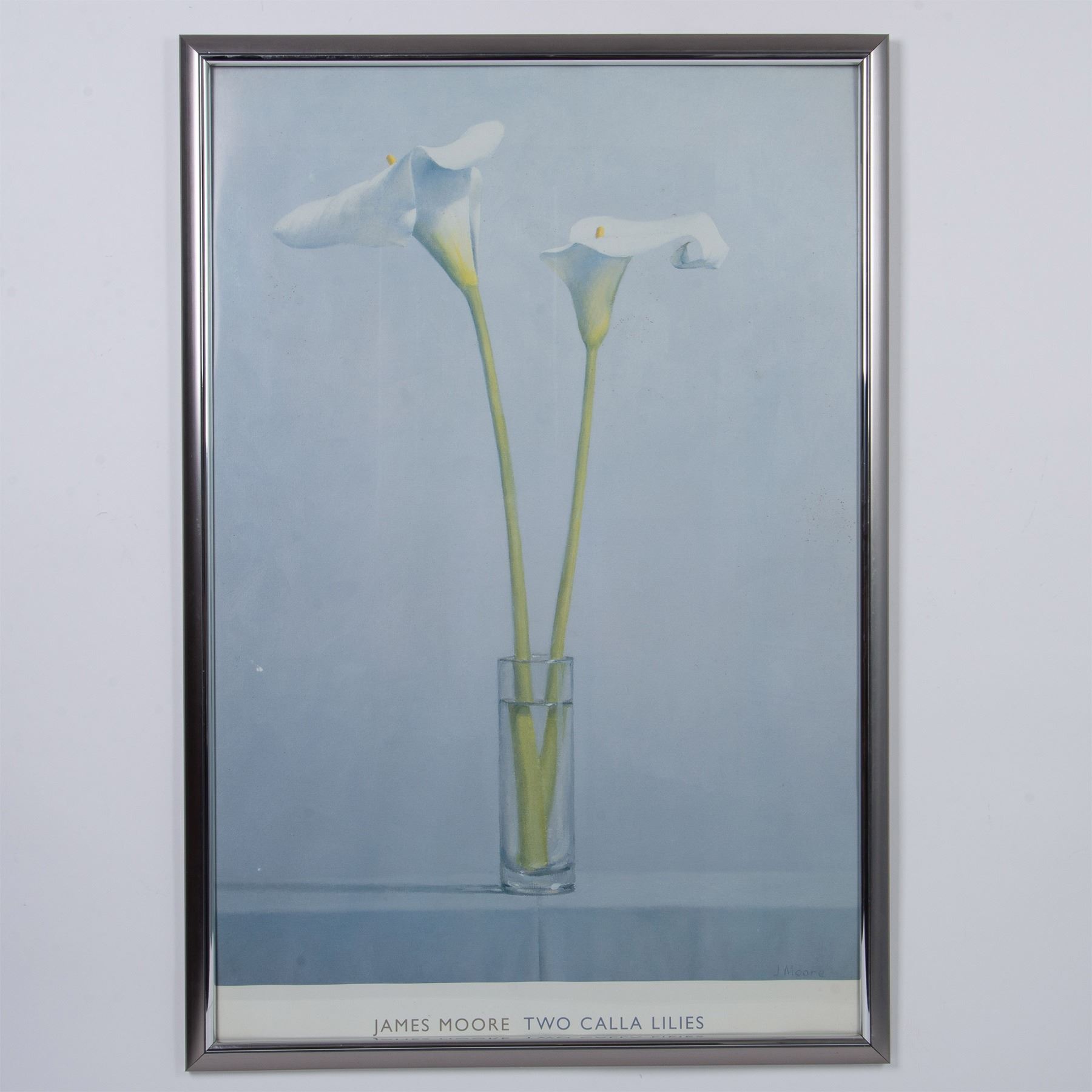 A large color offset on paper after a painting by artist James Moore, depicting two long stemmed calla lilies in a glass vase. Artists signature in plate on lower right. Housed in a metallic colored frame. Sight size: Artwork can be unframed and rolled for shipment.