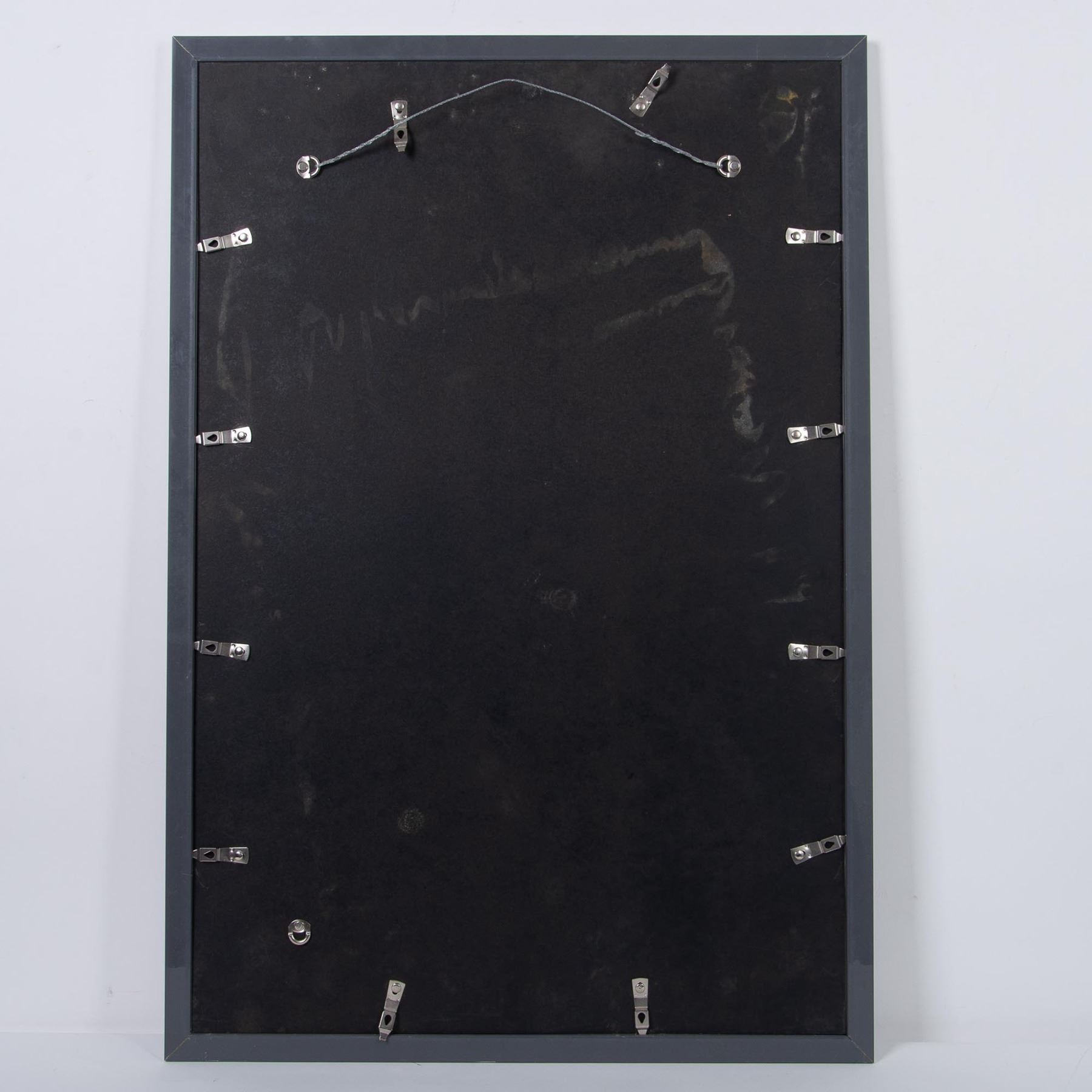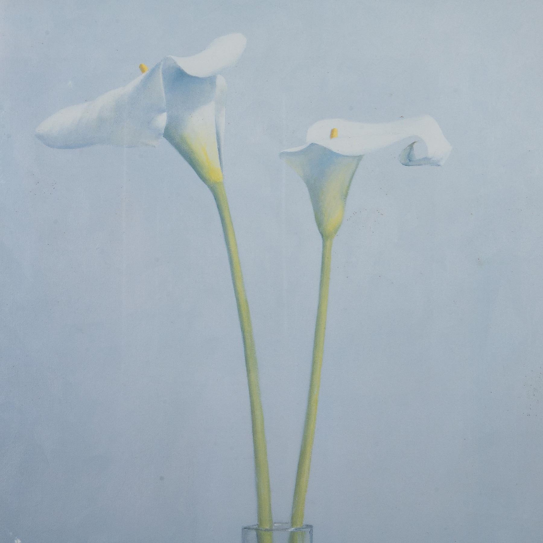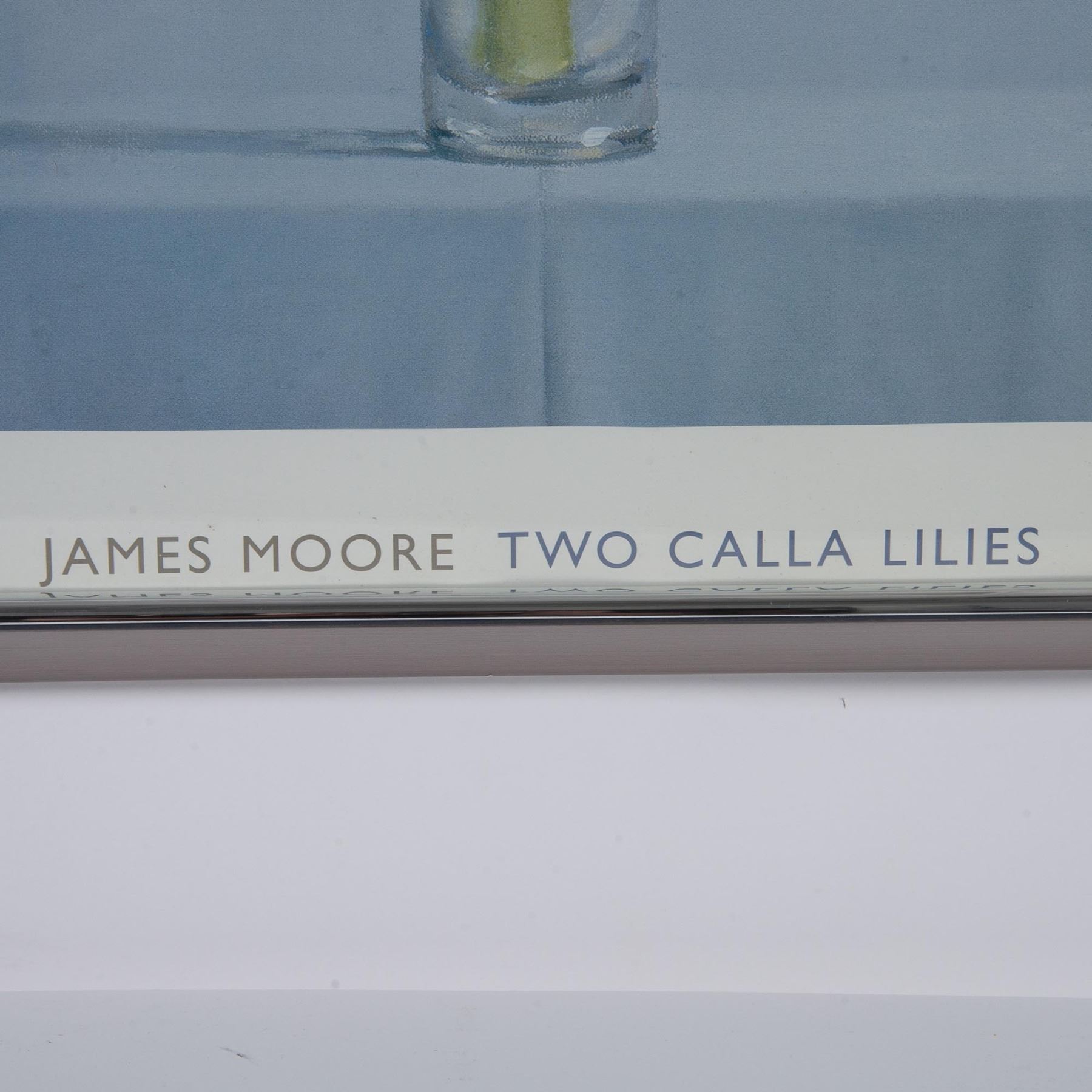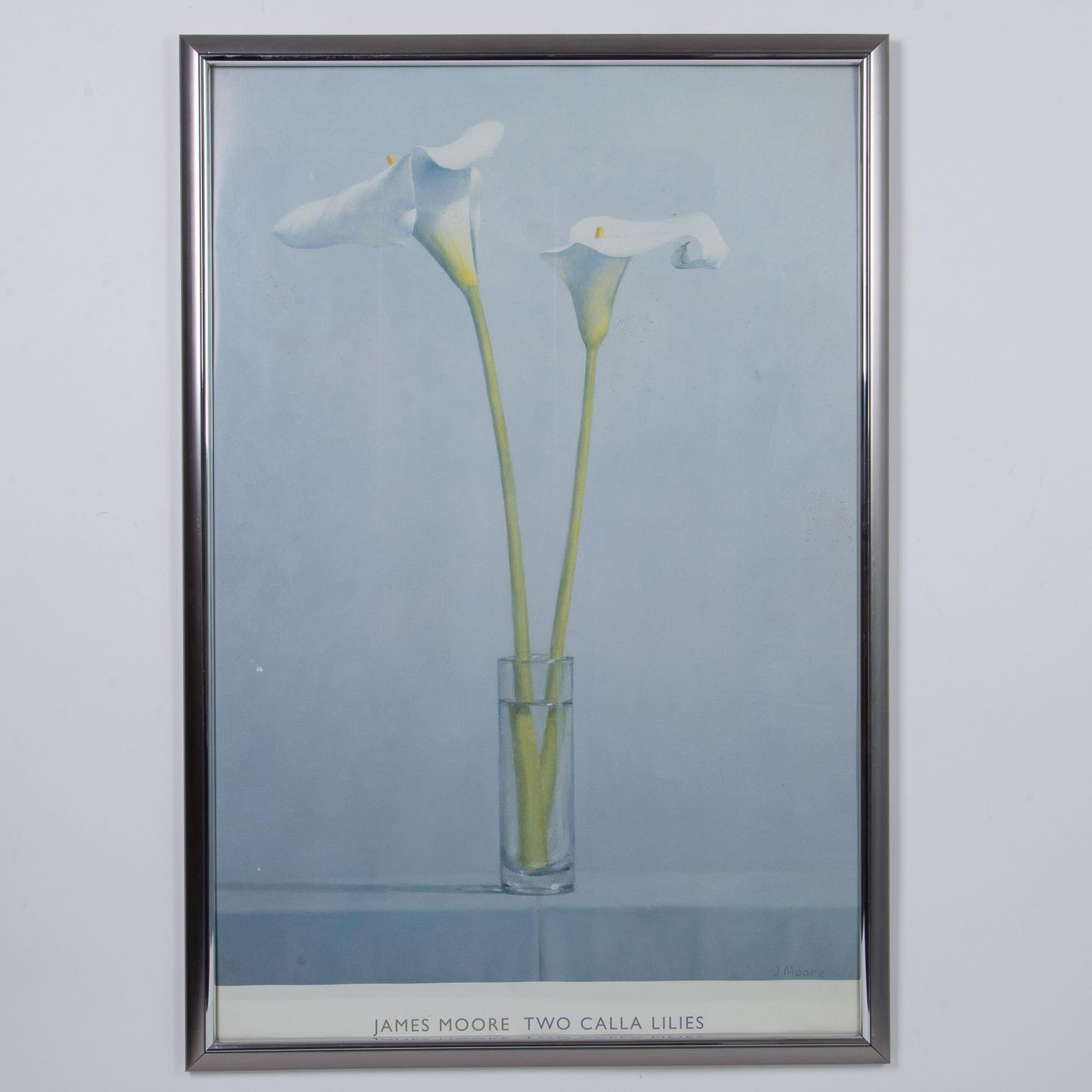 A large color offset on paper after a painting by artist James Moore, depicting two long stemmed calla lilies in a glass vase. Artists signature in plate on lower right. Housed in a metallic colored frame. Sight size: Artwork can be unframed and rolled for shipment.
