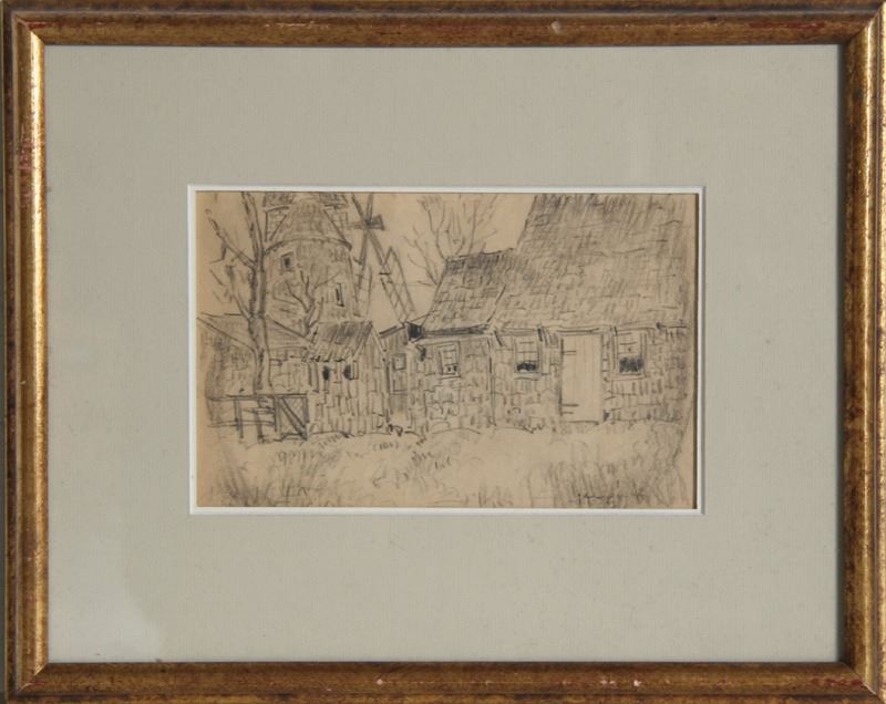 James Moore Preston, Shingle House and Windmill, The Hamptons, Long Island, Pencil Drawing