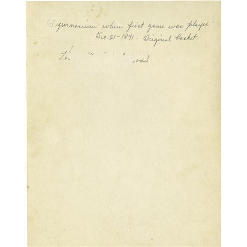 <B>Exceptional Photograph of Springfield Basketball Court.</B></I> Artful image documents the scene of basketball's birth as it appeared that historic December day. This marvelous sepia photo finds Mr. Stebbins' peach basket nailed to the balcony of the Springfield gym, the ball positioned directly below. Developed from the original negative some years after that historic game, the photo offers a notation from Naismith's daughter on verso, reading, "Gymnasium where first game was played, Dec. 21-1891 - Original basket, Helen Naismith Dodd." While we can't be certain of the exact date of the image itself, the fact that this is notated as the "Original basket," and the fragile nature of these first "hoops," as documented by Naismith himself, guarantees that it dates from the sport's first weeks. The photo measures 5x6.5" in size, cropped at top and bottom. EX-MT.<BR><BR><b>Shipping:</b> Small Flat (<a target="_blank" href="http://www.heritageauctions.com/common/shipping.php">view shipping information</a>)