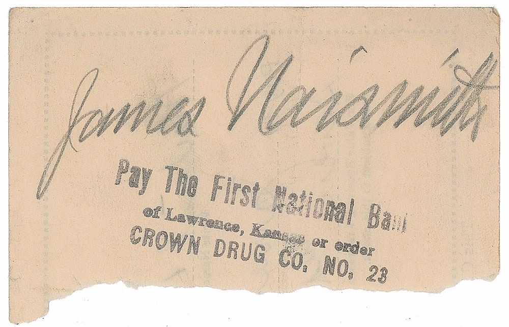 Scarce pencil signature, "James Naismith,” on an off-white 3.5 x 2.25 slip clipped from the end of an endorsed check. In fine condition.
