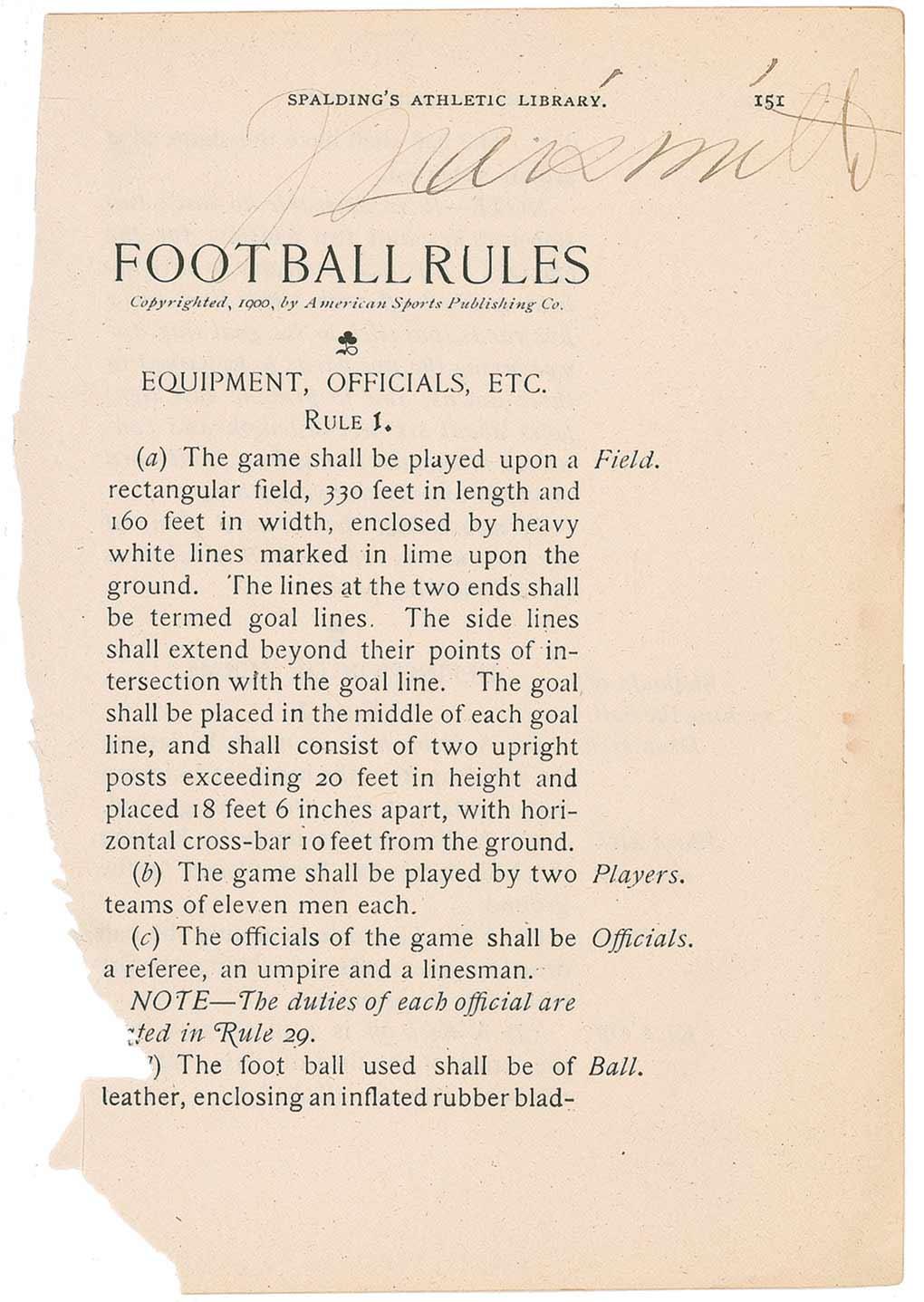 Inventor and founder of basketball. Book page from Spalding’s Athletic Library, 4.5 x 6.75, bearing the beginning of Football Rules, signed across the top, “J. Naismith.” In very good condition, with signature a shade light, mild overall toning, and paper loss to left edge from removal from book.