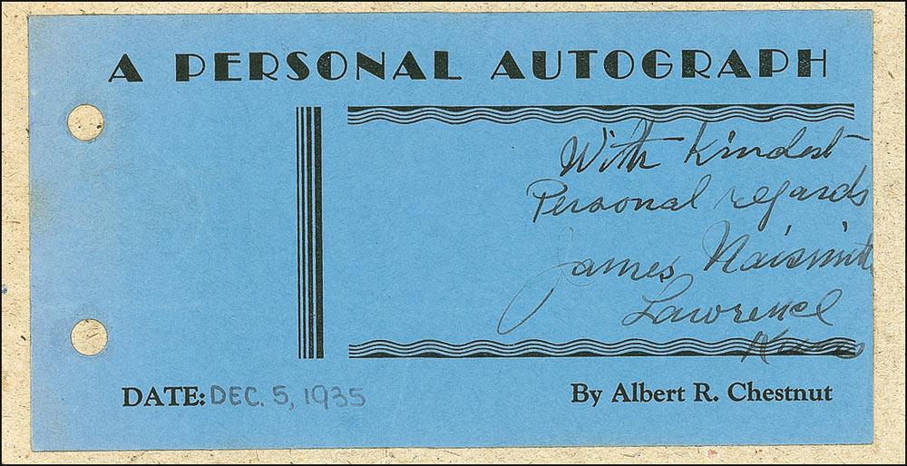 Inventor and founder of basketball. Vintage fountain pen signature, “With kindest personal regards, James Naismith, Lawrence Kansas” and dated in another hand, December 5, 1935, on a 5.5 x 2.75 blue card from the Albert R. Chestnut collection, affixed to a slightly larger gray card. In fine condition. Pre-certified Steve Grad/PSA/DNA and RRAuction COA.