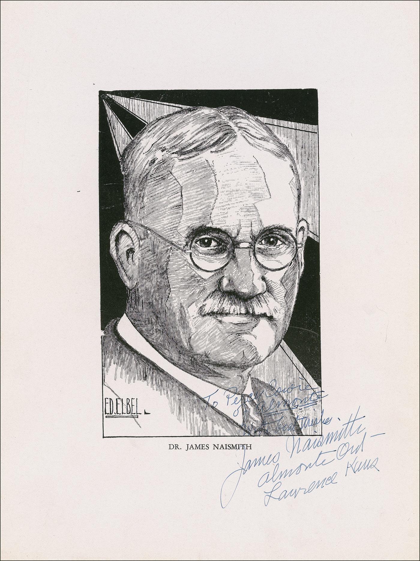 Inventor and founder of basketball. Uncommon vintage print, 7.5 x 10, of Dr. Naismith by his friend and fellow professor Ed Elbel, signed and inscribed in blue ink, “To Percy Cowie of Almonte, With best wishes, James Naismith, Altamonte, Ont–Lawrence, Kansas.” Naismith was born in Altamonte in 1861. In fine condition, with some scattered light edge creasing and wrinkling, and some light contrast to beginning of inscription. First signed image of Naismith we have ever offered. Pre-certified Steve Grad/PSA/DNA and RRAuction COA.