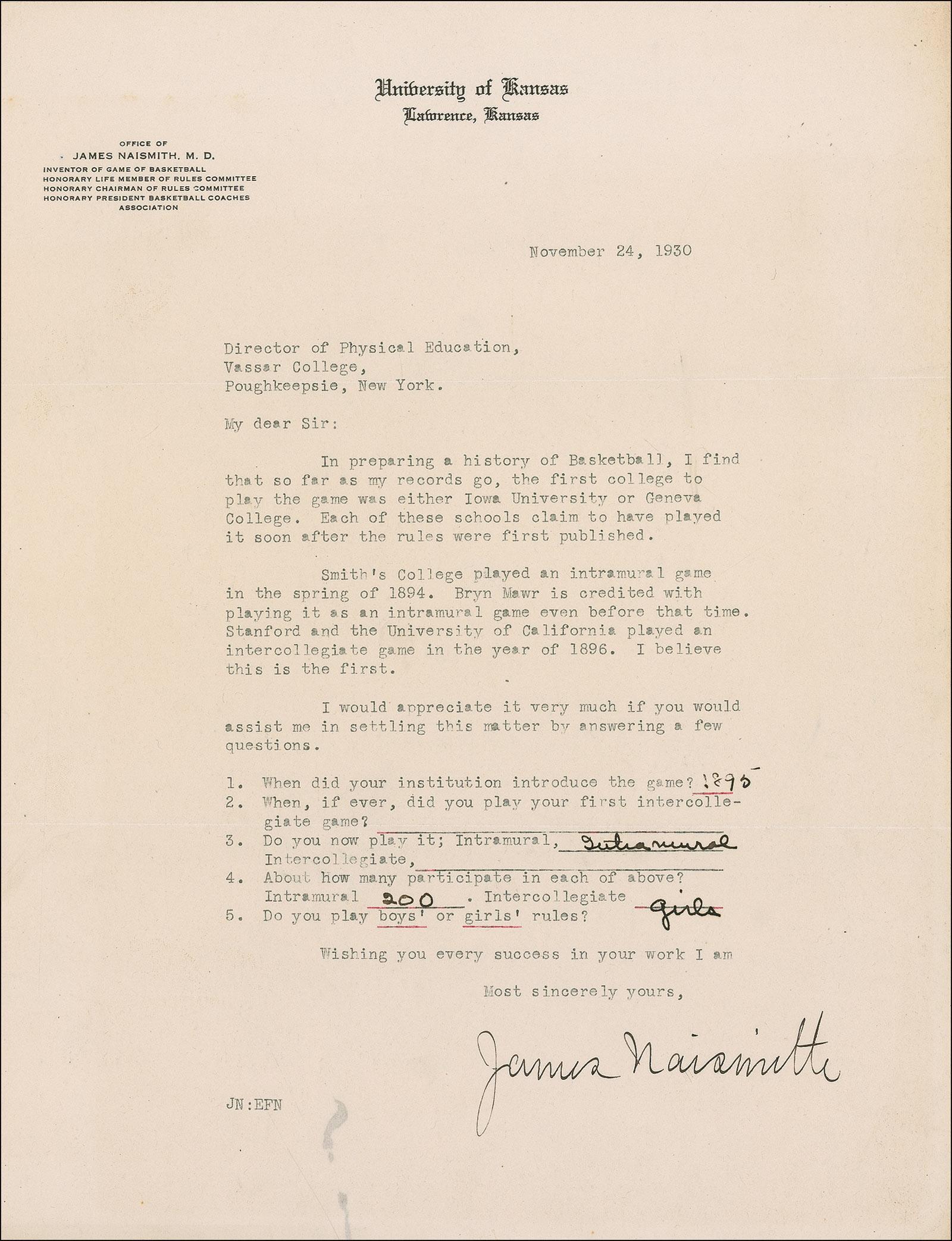 TLS, one page, 8.5 x 11, University of Kansas letterhead, November 24, 1930. Letter to the Director of Physical Education at Vassar College inquiring about the beginnings of the basketball program there. In part: “In preparing a history of Basketball, I find that so far as my records go, the first college to play the game was either Iowa University or Geneva College. Each of these schools claim to have played it soon after the rules were first published. Smith’s College played an intramural game in the spring of 1894. Bryn Mawr is credited with playing it as an intramural game even before that time. Stanford and the University of California played an intercollegiate game in the years of 1896. I believe this is the first.” Naismith then lists five questions regarding Vassar’s basketball program, four of which have been filled in by the letter’s recipient. In fine condition. Accompanied by a letter of authenticity from Naismith’s granddaughter, Helen Carpenter.