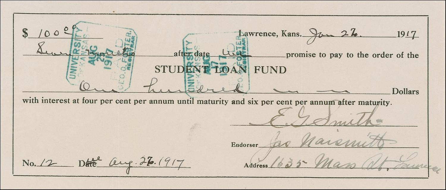 Inventor and founder of basketball. DS, signed “Jas. Naismith, 1635 Mass St. Lawrence” one page, 7.75 x 3.25, January 26, 1917. Promissory note promising to pay $100.00 to a Student Loan Fund. Signed at the conclusion by Naismith as endorser. In fine condition, with two vertical folds, one touching his last name, and two green cancellation stamps. Accompanied by a letter from an E. G. Smith sent to Naismith referencing the return of the note and the original mailing envelope addressed to Naismith. Items signed by basketball’s founder continue to be highly prized by sports enthusiasts.