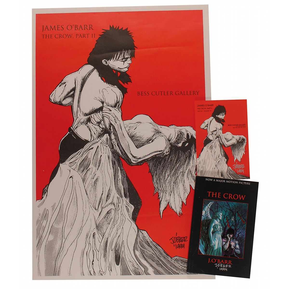 Four items: one 1994 softcover edition of The Crow, signed on the front cover in silver ink, “J. O’Barr, 1994”; one 5.5 x 8.5 card advertising an exhibition by O’Barr, signed in silver ink; one poster advertising the exhibition, 19.5 x 29.5, signed in black felt tip; and one movie poster for The Crow, 27 x 40, signed in silver ink. Scattered marks to cover of book, and moderate scattered creases to posters, otherwise overall fine condition.