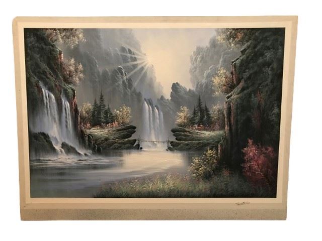 This is an impressionist painting on canvas by James O'Neil. The painting depicts a serene and mystical landscape. A majestic waterfall cascades down a cliff face, framed by lush greenery and towering mountains. The water reflects the warm glow of a hidden sun, casting a soft light across the scene. Size: 4'x3'.