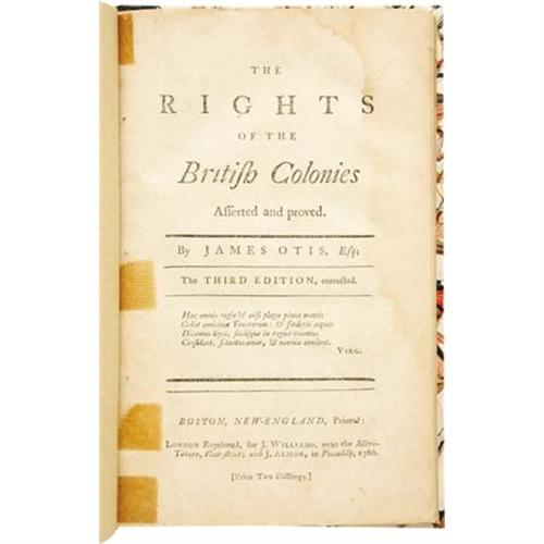 <B>James Otis: <I>The Rights of the British Colonies Asserted and Proved</B></I></B></I> (Boston, New-England Printed: London Reprinted for J. Williams and J. Almon, 1766), third edition, 120 pages, modern quarter morocco binding with gilt titles on a red leather spine plate and marbled paper boards, 8vo (5.25" x 8.25"). To a large extent, it was this very publication (in its first edition) that launched the political controversy that led to the American Revolution. <I>The Rights of the British Colonies Asserted and Proved</B></I> was originally written in response to the imposition of the Sugar Revenue Act of 1764, the first in a long line of British tax acts that the American colonists found particularly offensive. The book is in about very good condition, with moderate toning and mild damp-staining throughout the textblock, and a few scattered holographic notations in an unknown hand (Otis's himself?). A handsome example of a highly important early American imprint.<BR><BR><b>Shipping:</b> Books & Catalogs (<a target="_blank" href="http://www.heritageauctions.com/common/shipping.php">view shipping information</a>)