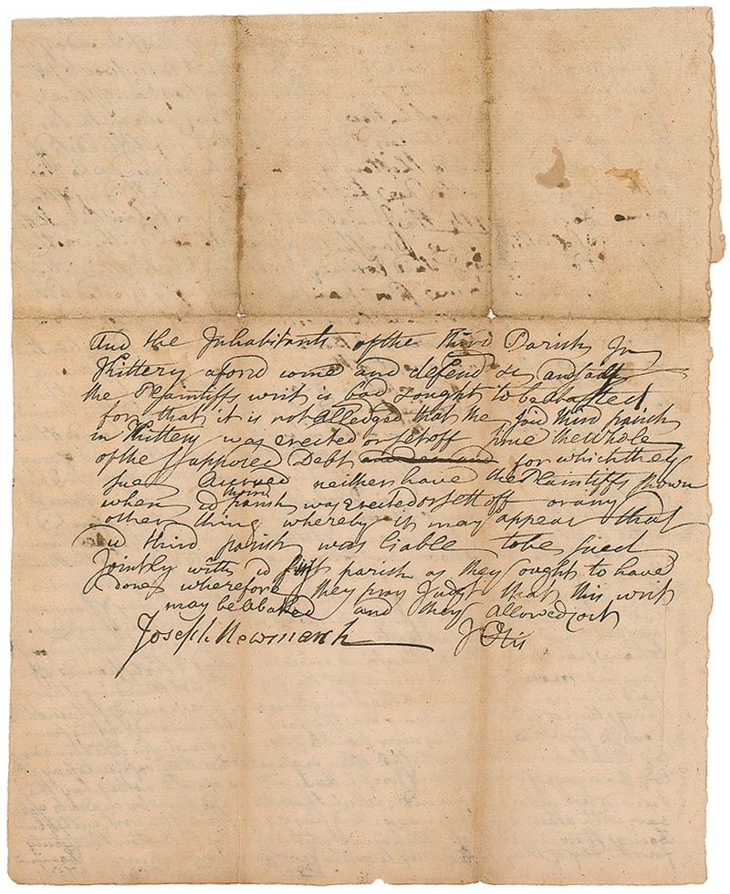 American statesman and lawyer (1725–1783) generally known as the originator of the phrase “No taxation without representation.” Manuscript DS, signed “J. Otis,” one page, 7.5 x 9.5, 1754, the top of which is affixed to a larger sheet. Lengthy document, headed “George the Second, by the Grace of God, of Great Britain, France and Ireland King, Defender of the Faith…To any Coroner of our County of York or his Deputy,” commanding the summons of “the inhabitants of First Parish in Kittery in our Sd. County of York.” In very good condition, with intersecting folds, one passing through a single letter of the signature, uniform toning with some scattered heavier spots, some partial separations to the folds, and a rough left edge.