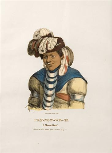 James Otto Lewis (1799-1858). Two hand-colored lithographs. (1) PEN-NOW-WE-TA - A Miami Chief. 10 1/2" x 8 1/4".(2) WA-KAUN - Snake - A Winnebago Chief. 12 1/4" x 9". (est $1,500-2,500)