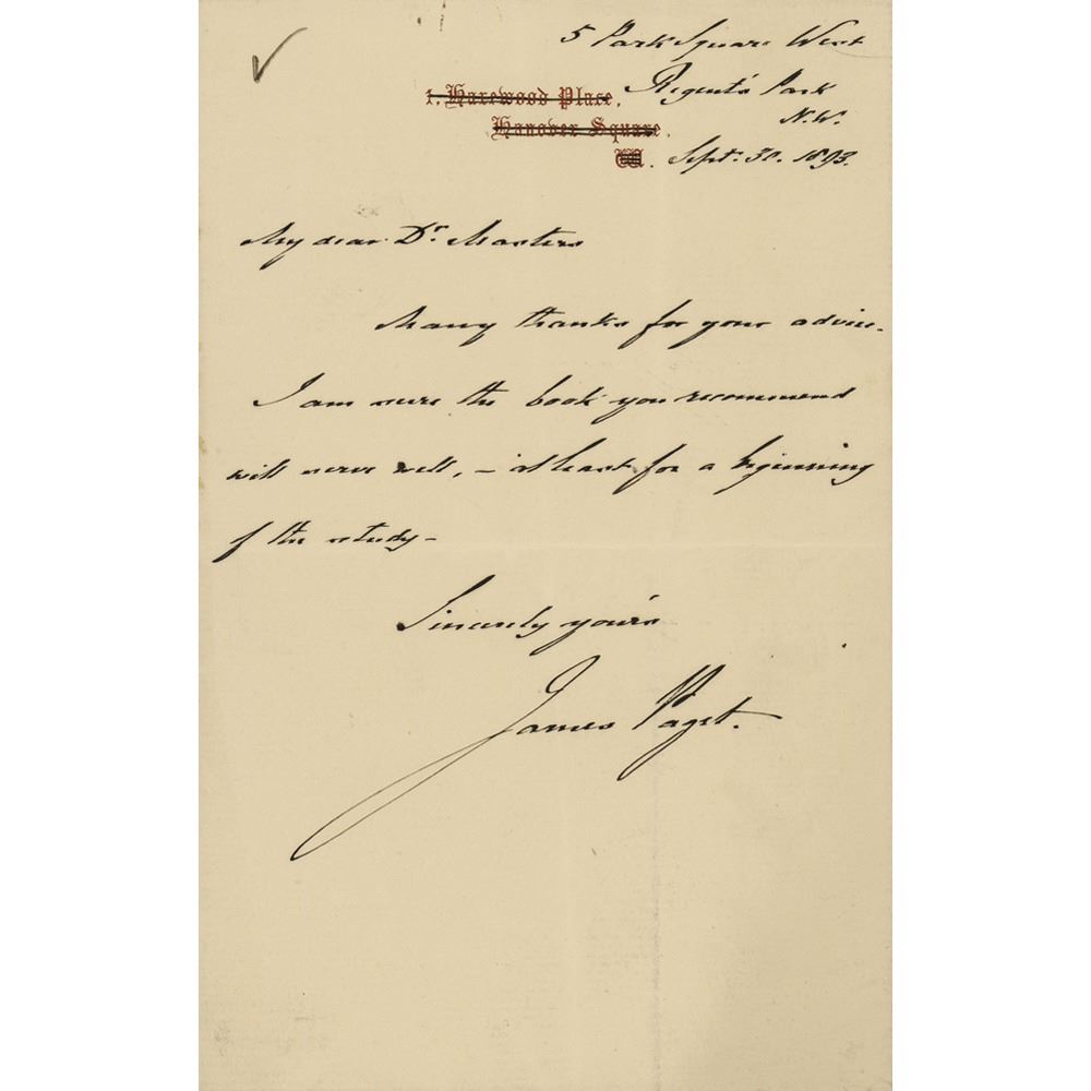 Important English surgeon and pathologist (1814-1899). ALS, one page, 4.5 x 7, personal letterhead, September 30, 1893. Handwritten letter to English botanist and taxonomist Maxwell T. Masters, in full: "Many thanks for your advice. I am sure the book you recommend will serve well,—at least for a beginning of the study." In fine condition.