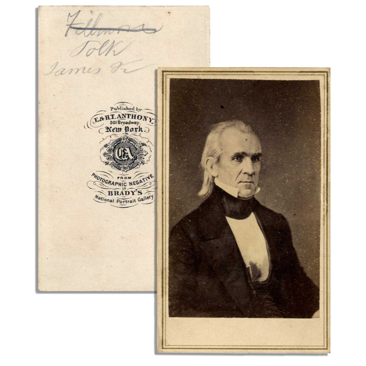 James Polk CDV taken in February 1849 by Mathew Brady. Polk, the eleventh President, would turn the White House over to Zachary Taylor the following month. He is the earliest President whose photos taken in office still survive. ''E. & H.T. Anthony, 501 Broadway, New York. / From Photographic Negative in Brady's National Portrait Gallery'' is stamped on the verso. Very good condition.