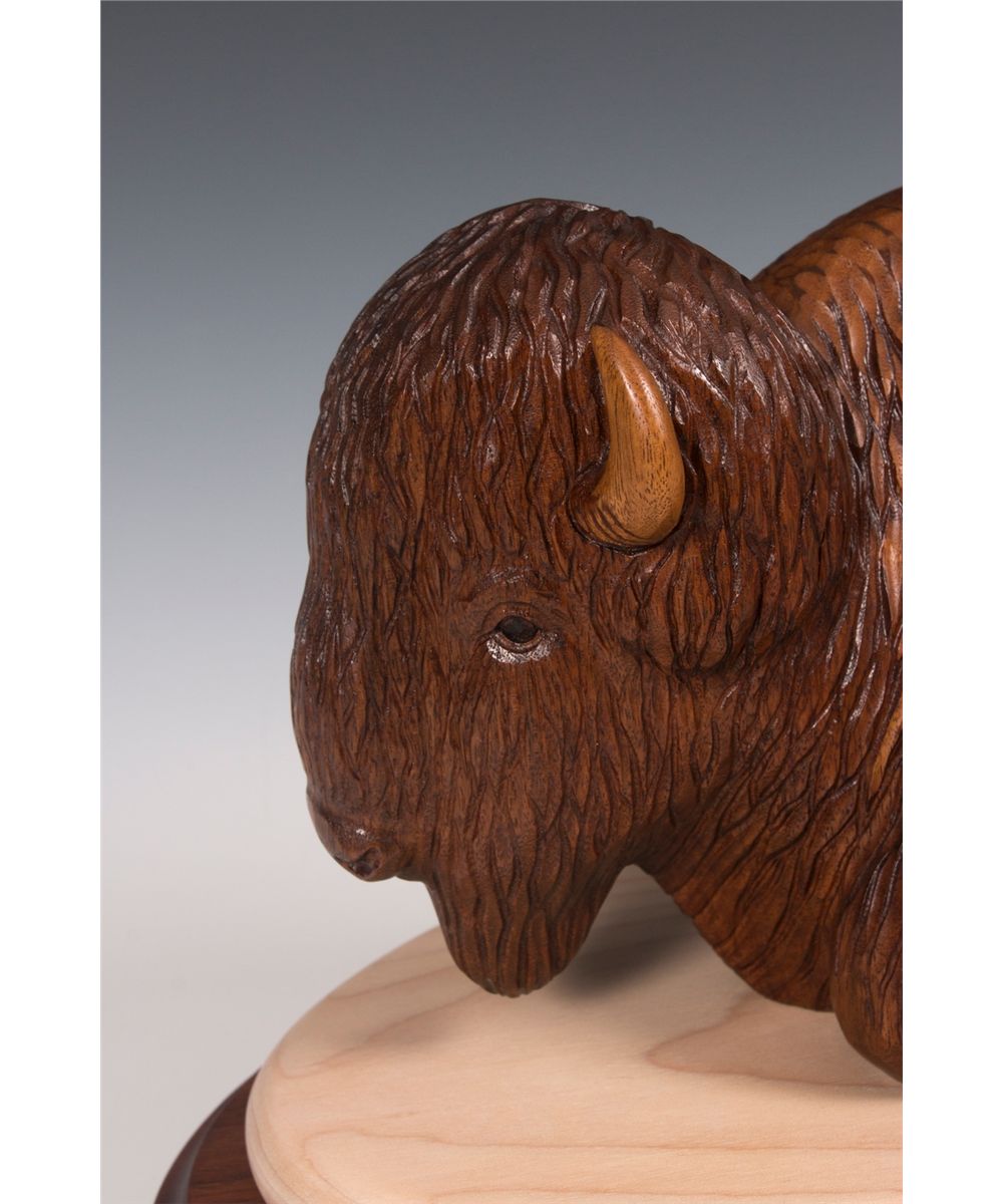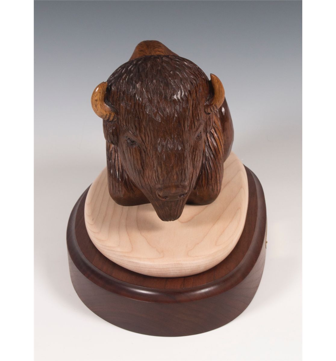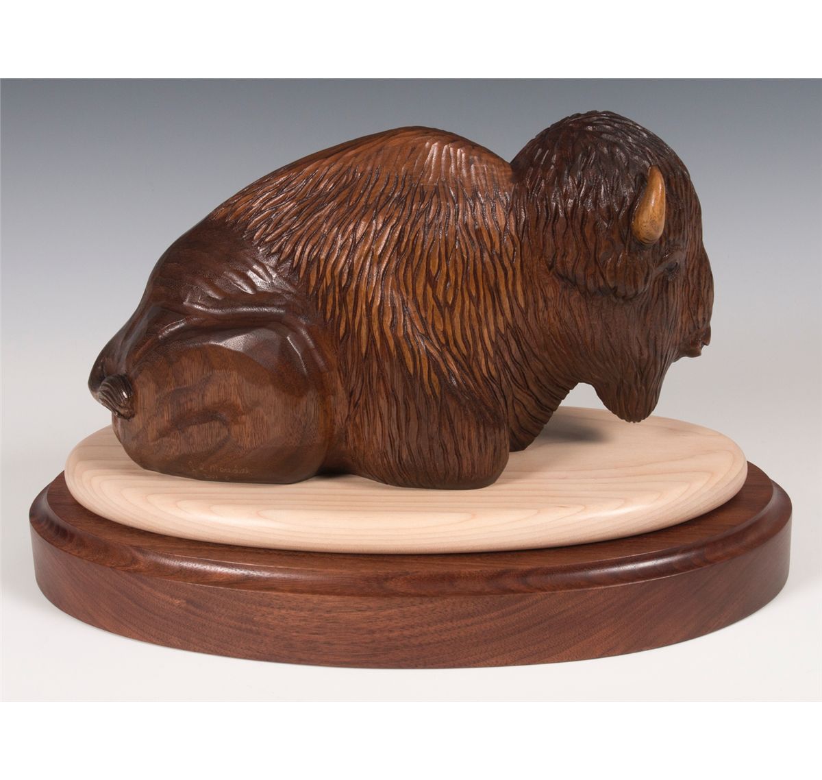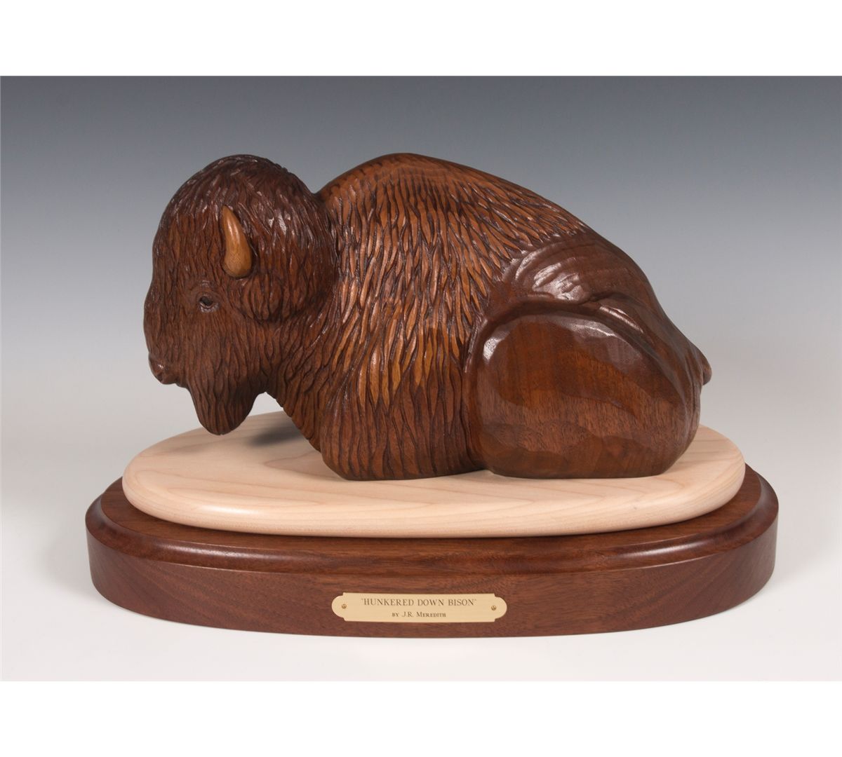 James R. Meredith (20th/21st centuries). Hunkered Down Bison. 8" x 13" x 6" woodcarving. Inscribed: J. R. Meredith 2001 © Livingston, MT. Provenance: Estate of Ken Holm, Denver, CO.