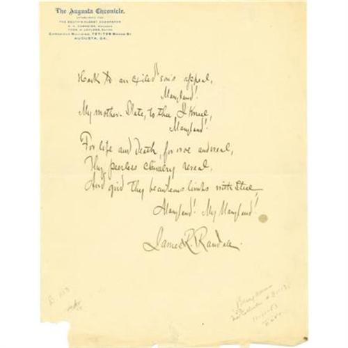 <B>James R. Randall Autograph Poem “Maryland! My Maryland” Signed</B></I> “<I>James R. Randall,</B></I>” one page, 8.5” x 11”. Augusta, Georgia, no date. Randall has penned the second stanza of his nine stanza poem, “Maryland! My Maryland!” on stationery of <I>The Augusta Chronicle</B></I>: “<I>Hark to an exiled son's appeal,/Maryland!/My mother State, to thee I kneel,/Maryland!/For life and death, for woe and weal,/Thy peerless chivalry reveal,/And gird they beauteous limbs with steel,/Maryland! My Maryland!</B></I>” After hearing of the death in of a friend involved in a skirmish with Union troops marching through Baltimore on April 19, 1861, Baltimore-born James R. Randall, teaching in Louisiana, was so aroused that he wrote the poem, “<I>Maryland! My Maryland!</B></I>” at night by candlelight. It first appeared in the April 26, 1861, issue of the New Orleans <I>Sunday Delta</B></I> and was eventually set to the music of “Tannenbaum, O Tannenbaum.” The song became very popular throughout the Confederacy. In 1939, “Maryland! My Maryland!” was adopted as the Maryland state song. Small circular stain in blank area at right. Portion torn off in blank lower left corner, frayed at bottom. Penciled collector's notes at bottom. Boldly penned and signed. Fine condition. <I>Ex. Henry E. Luhrs Collection.</B></I><BR><BR><b>Shipping:</b> Flat Material, Small (<a target="_blank" href="http://www.heritageauctions.com/common/shipping.php">view shipping information</a>)