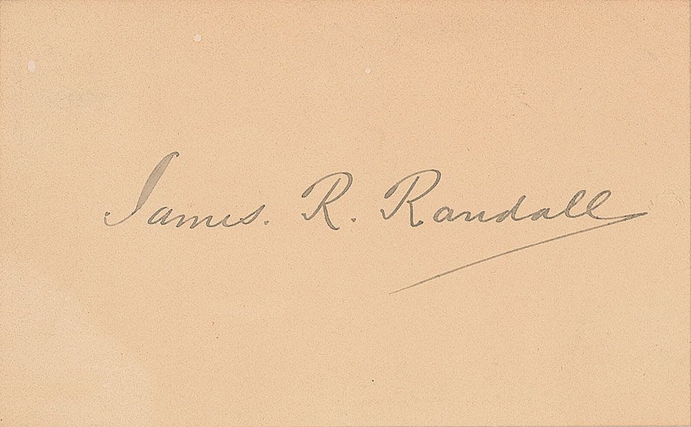 Writer (1839–1908) best remembered as the lyricist of the song, ‘Maryland, My Maryland.’ Vintage ink signature, “James R. Randall,” on an off-white 3.75 x 2.5 card. In fine condition, with a uniform shade of toning.