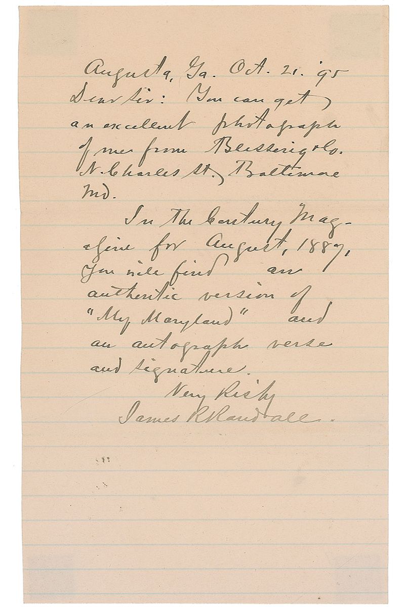 Writer (1839–1908) best remembered as the lyricist of the song, ‘Maryland, My Maryland.’ ALS, one page, lightly-lined, 5 x 8, October 21, 1895. Letter to H. W. Fay. In part: “You can get an excellent photograph of me from Beisserig & Co.…In the Century Magazine for August, 1887, you will find an authentic version of ‘My Maryland’ and an autograph verse and signature.” Uniform toning and small mounting remnants to reverse, otherwise fine condition. Accompanied by the original mailing envelope.