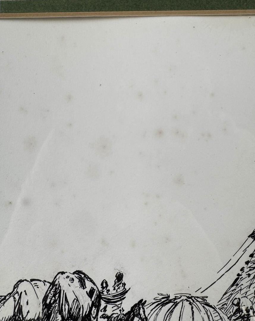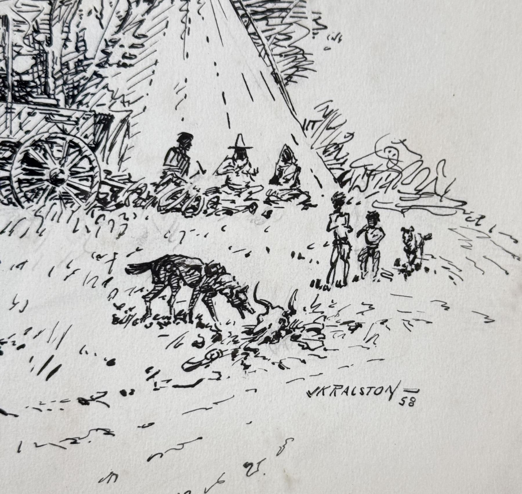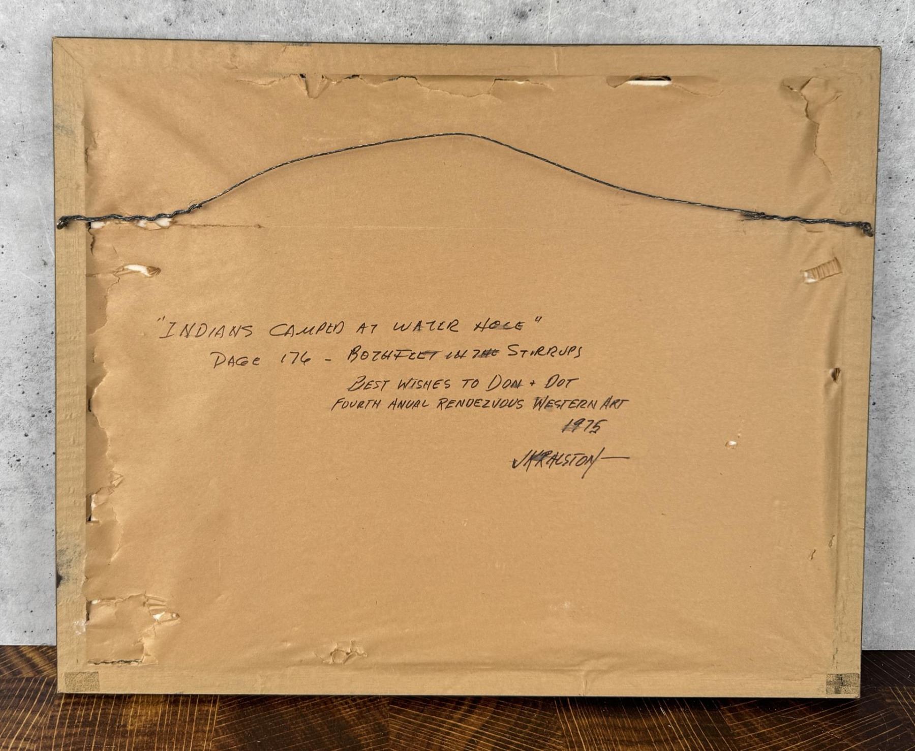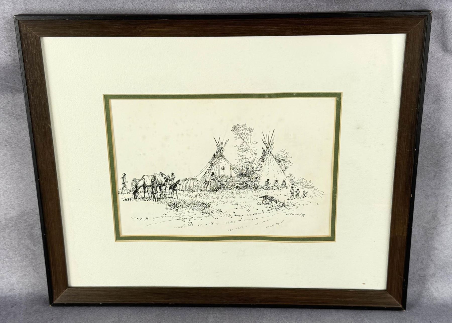 Illustrated on page 176 Both Feet in the Stirrups by Bill Huntington. Pen and Ink on Paper. 14 1/2" by 18" framed. Some foxing in the field as shown. James Kenneth Ralston (1896 - 1987) was active/lived in Montana. James Ralston is known for Historical-west, genre painting, illustration. James Kenneth Ralston was born in Choteau, Montana, on March 31, 1896. His paternal grandparents, left Independence, Missouri, by ox team for the gold camps of Colorado in 1859. His father was the first born to Samuel F. and Mary Gregg Ralston. In 1863, they headed for Idaho, and in 1864 they moved to the Alder Gulch area in the Montana Territory. In the spring of 1878, his father, Will Ralston, moved the Ralston cattle to the Teton River near Choteau, Montana. In 1885, Will Ralston married Ellen Mathewson and they had five children of which James Kenneth Ralston was the fifth child. In 1903, Will Ralston took over as the general manager of the Flying U Ranch near Choteau, Montana. They then moved to Helena where James Kenneth Ralston received his first formal art instruction. In 1905, his father was engaged by B. H. Tatum of Helena to put together a cow outfit. In 1906, the family moved from Helena to the Capital P ranch just south of the Missouri River across from the Fort Peck Indian Reservation. In 1917, he went to Chicago and enrolled at the Chicago Art Institute for a brief three month tuition. Upon entering the U. S. Army the following spring, he served with the 62nd Infantry, Eighth Division. In the fall of 1920, he again went to Chicago and entered the Chicago Art Institute again. After his marriage in 1923 to his wife, Willo, they went to the Pacific coast where for seven years he worked as a commercial artist doing illustrations for books, newspapers, and advertising agencies. They came back to Montana in 1930 to take over his father's ranch, the Roman E, near Culbertson, but the Depression and drought made them leave in 1935. They decided on Billings for his studio and that began his vocation as a professional artist. His work is in the Jefferson National Expansion Memorial in St. Louis, Missouri; the Custer Battlefield National Monument; and the Montana Historical Society in Helena, Montana. His murals adorn many fine retail and professional locations throughout the country. James Kenneth Ralston died in 1987.