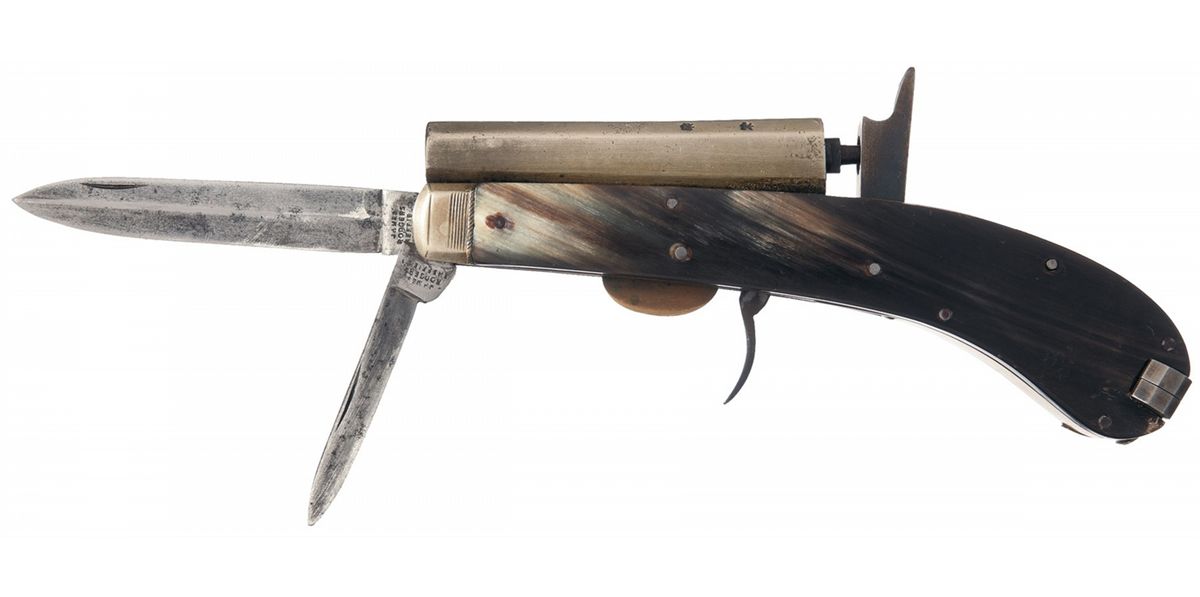 The German silver barrel has two British proofs stamped on the upper left flat. The 2 inch and 3 inch blades are marked "JAMES/RODGERS/SHEFFIELD" on the left ricasso. The knife and pistol are enclosed in a German silver case with smooth stag scales riveted to the sides. A folding lid compartment for caps is located in the back strap and provisions for tools are on the sides of the frame at the butt. These included tools are a bullet mold and tweezers.