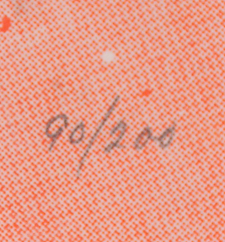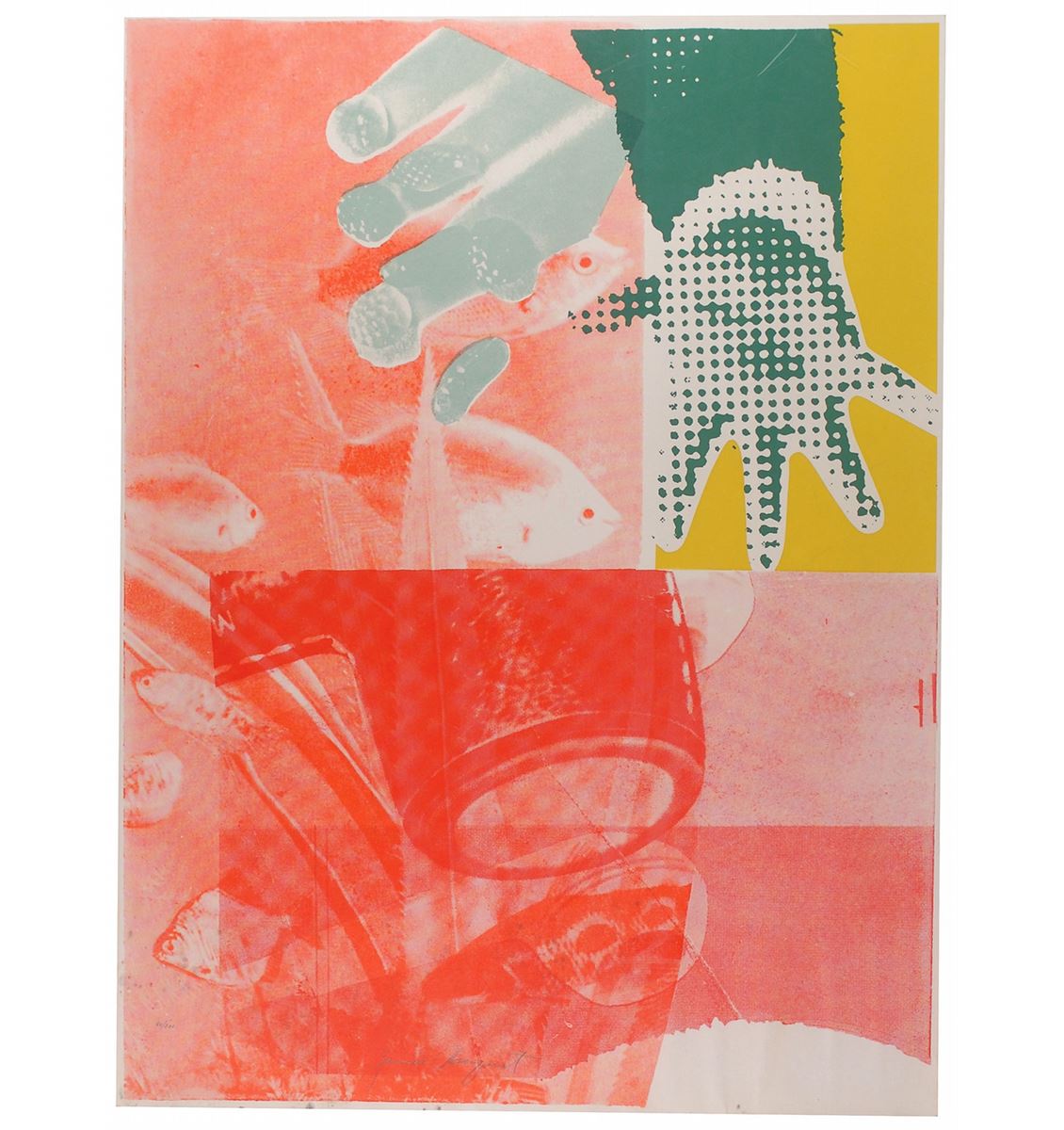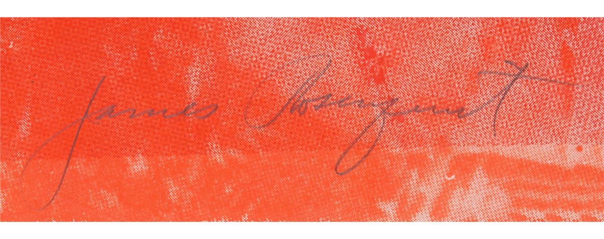 Color limited edition 26.5 x 32.25 serigraph entitled ‘For Love,’ numbered 90/200, depicting a ‘pop art’ layering of images like a hand and fish, signed in pencil along the lower edge, “James Rosenquist.” Rolled and in fine condition, with a trivial area of discoloration to lower right and slight scattered soiling to lower portion.