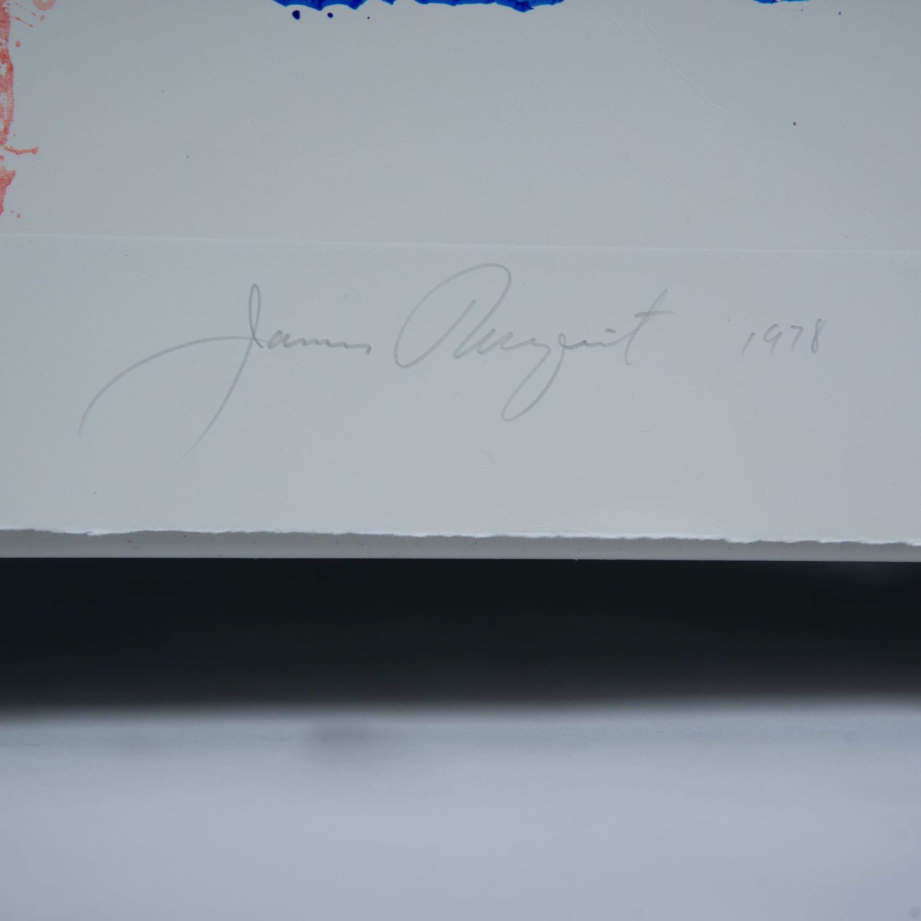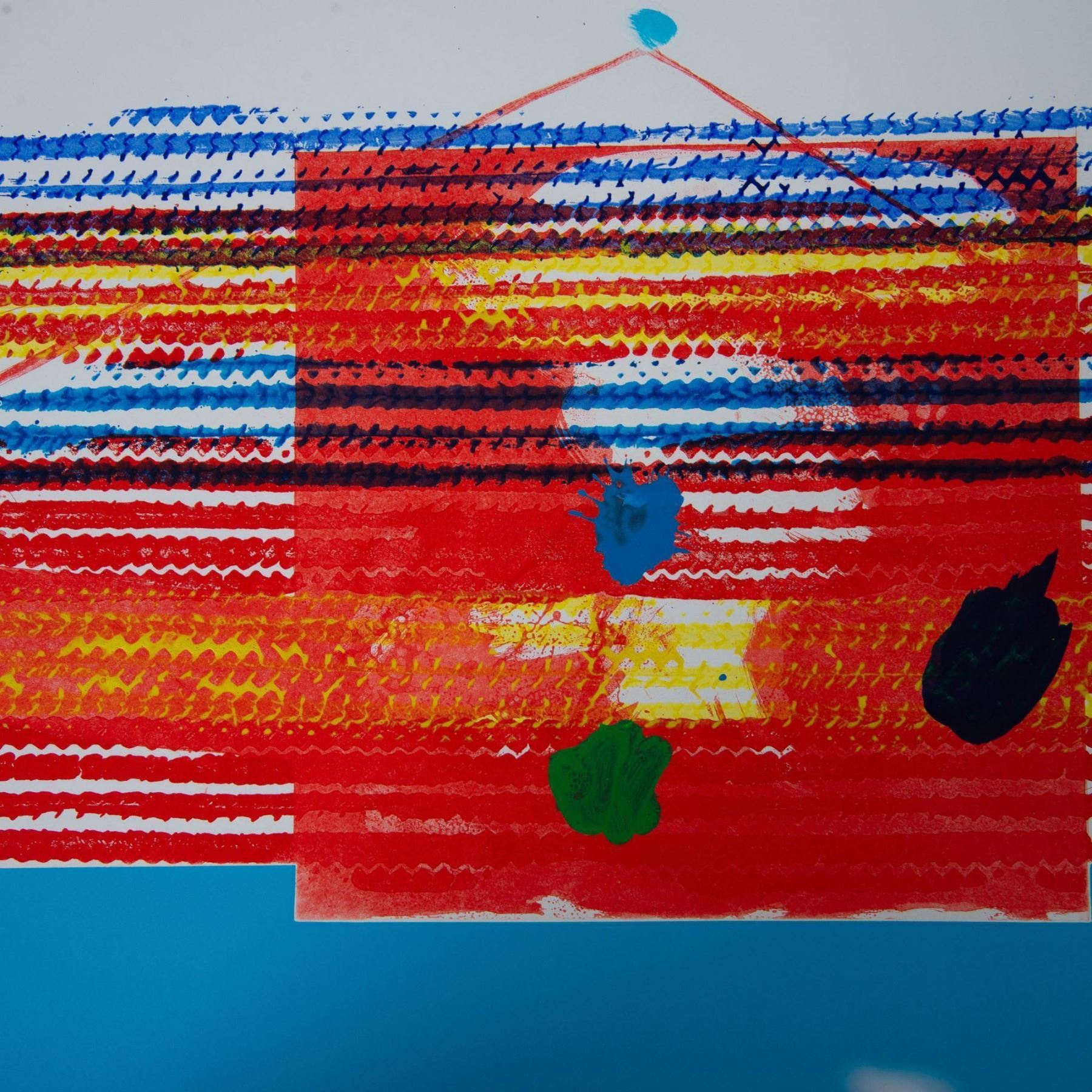 A vibrant and unique color intaglio and relief print on Pescia Italian paper by renowned American Pop artist James Rosenquist (1933€“2017). Titled Window Washer Glass House, this artwork features a dynamic abstraction highlighted by hand-coloring with a rubber tire, a hallmark of Rosenquist's innovative techniques. The bold composition, blending vivid reds, yellows, and blues, evokes a sense of industrial modernity and energy. Signed and dated by the artist in graphite on the lower right, "James Rosenquist 1978," with the edition and title on the lower left: "49/78 Window Washer Glass House." This print exemplifies Rosenquist's contribution to the Pop Art movement, merging commercial art elements with fine art. James Rosenquist was one of the most influential figures in the Pop Art movement, alongside contemporaries such as Andy Warhol, Roy Lichtenstein, and Claes Oldenburg. Originally trained as a billboard painter, Rosenquist's background in large-scale commercial art greatly influenced his artistic practice, as seen in his monumental works and use of fragmented imagery. Rosenquist's art often juxtaposes disparate images€”drawn from advertising, consumer culture, and personal experiences€”to create thought-provoking compositions that challenge perceptions of modernity and media. His groundbreaking work, F-111 (1965), is considered a masterful critique of the military-industrial complex and consumer culture. A recipient of numerous accolades, Rosenquist's works are held in prestigious collections worldwide, including the Museum of Modern Art (MoMA) in New York, the Art Institute of Chicago, and the Tate Gallery in London. His innovative use of vibrant colors and unconventional materials continues to resonate with collectors and art enthusiasts alike.