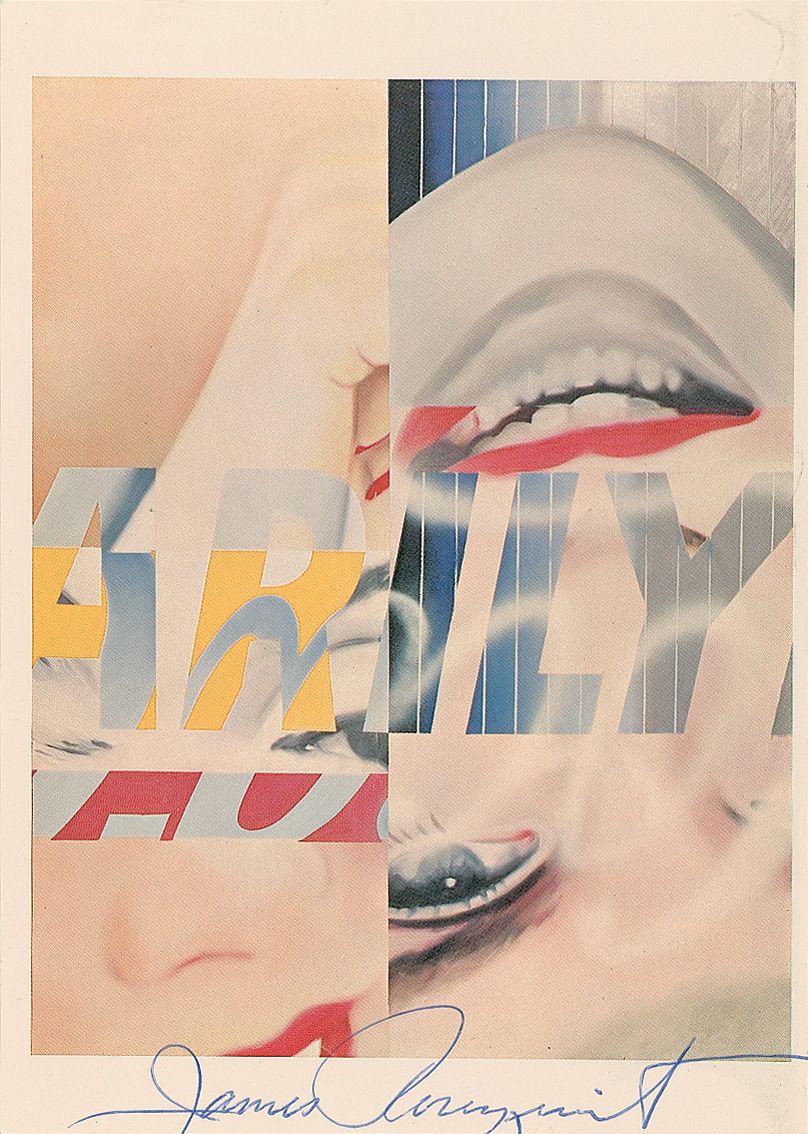 Two identical color 4.25 x 6 postcards of Rosenquist’s ‘Marilyn Monroe,’ one signed in blue felt tip, the other signed in blue ballpoint. In fine condition, with a couple light bends to both and some light surface rubbing.