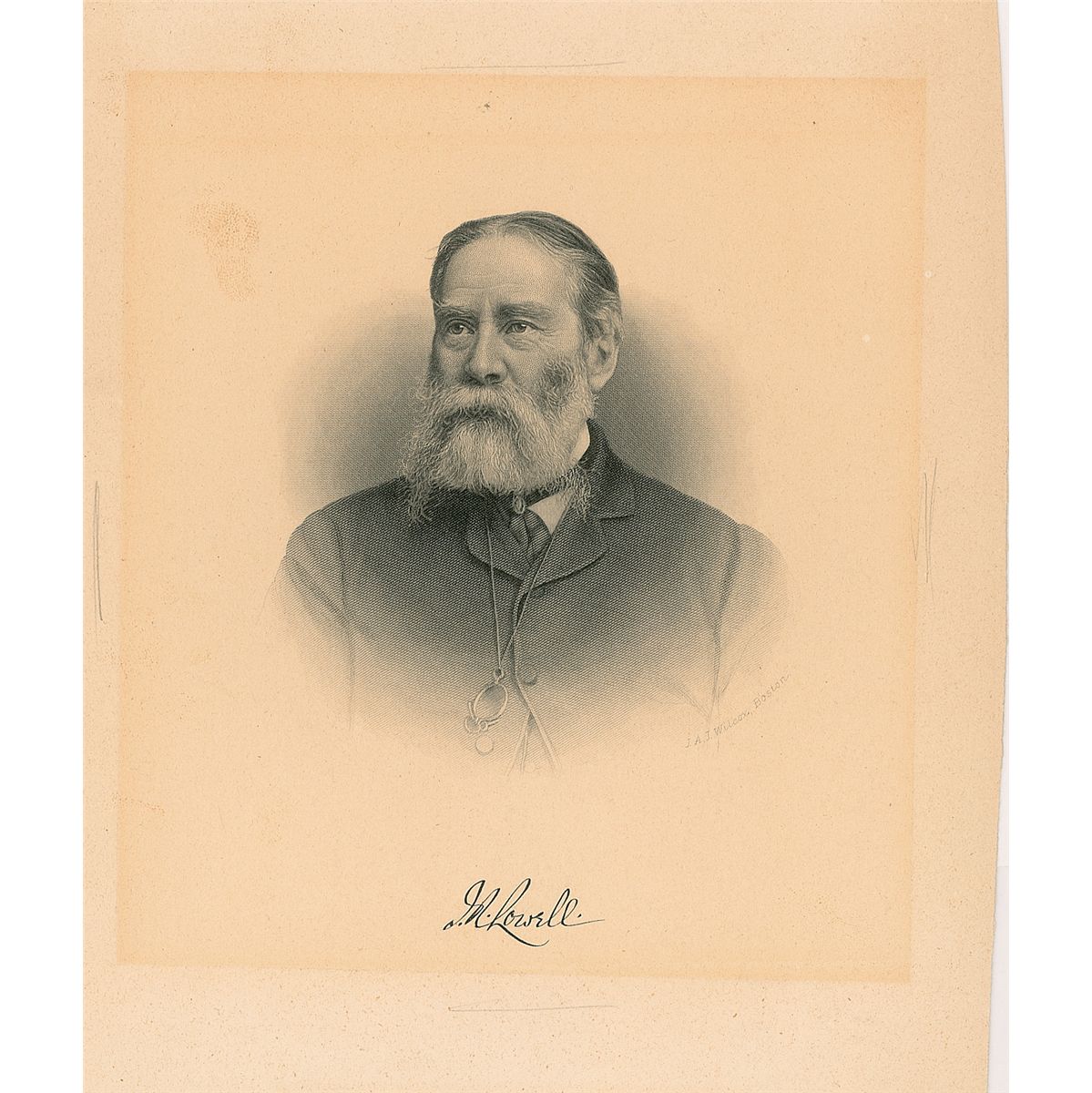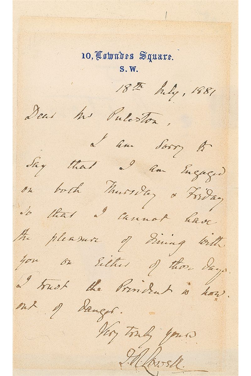American writer and diplomat (1819–1891) who, after a long and successful career as a poet, satirist, and essayist, served as minister to the court of Spain. ALS signed “J. R. Lowell,” one page, 3.5 x 5.75, personal letterhead, July 18, 1881. Letter to Mr. Puleston. In full: “I am sorry to say that I am engaged on both Thursday & Friday so that I cannot have the pleasure of dining with you on either of those days. I trust the President is now out of danger.” In very good condition, with central horizontal and vertical fold, trimmed left edge, mounting remnants to reverse, and overall light toning from previous display. The casual mention of the President's danger was actually the attempt to assassinate James A. Garfield just 16 days earlier on July 2 by Charles J. Guiteau. Garfield clung to life for 12 weeks, eventually dying from complications of blood poisoning.