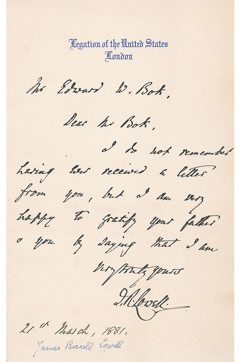 ALS signed “J. R. Lowell,” one page, 4.5 x 7, Legation of the United States London letterhead, March 21, 1881. Letter to author and editor Edward Bok. In full: “I do not remember having ever received a letter from you, but I am very happy to gratify your father & you by saying that I am very truly yours.” In fine condition, with a small ink notation under date.