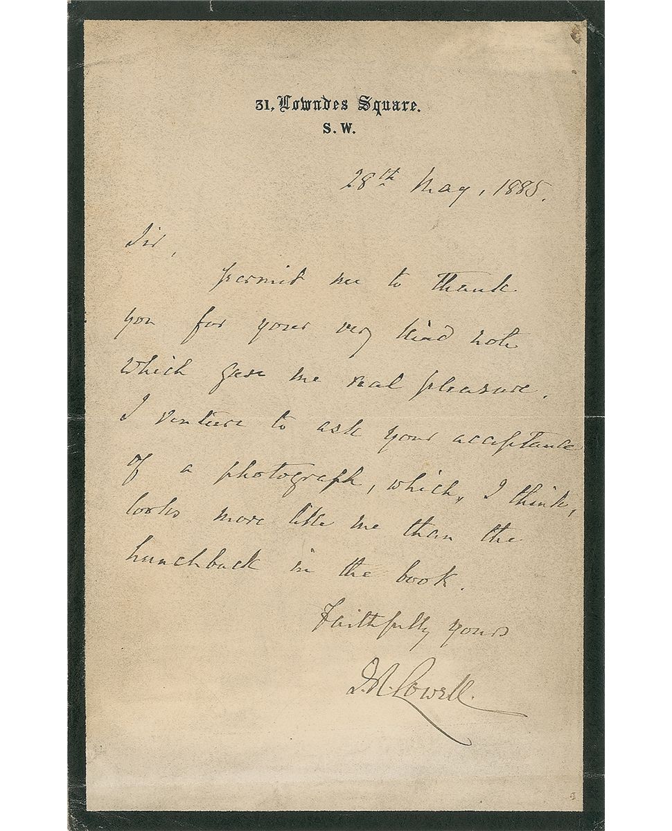 American writer and diplomat (1819–1891) who, after a long and successful career as a poet, satirist, and essayist, served as minister to the court of Spain. ALS signed “J. R. Lowell,” one page, 4.5 x 7, black-bordered personal letterhead, May 28, 1885. Letter to an unidentified gentleman. In full: “Permit me to thank you for your very kind note which gave me real pleasure. I venture to ask your acceptance of a photograph, which, I think, looks more like me than the hunchback in your book.” Mild soiling and a few creases, otherwise fine condition. Accompanied by an unsigned carte-de-visite photo of Lowell by J. E. Tilton and Co. of Boston. Lowell’s second wife Frances, had died on February 19, 1885, while they were still living abroad after he served as Minister to England. During the 1880s he published several collections of political essays and poetry.