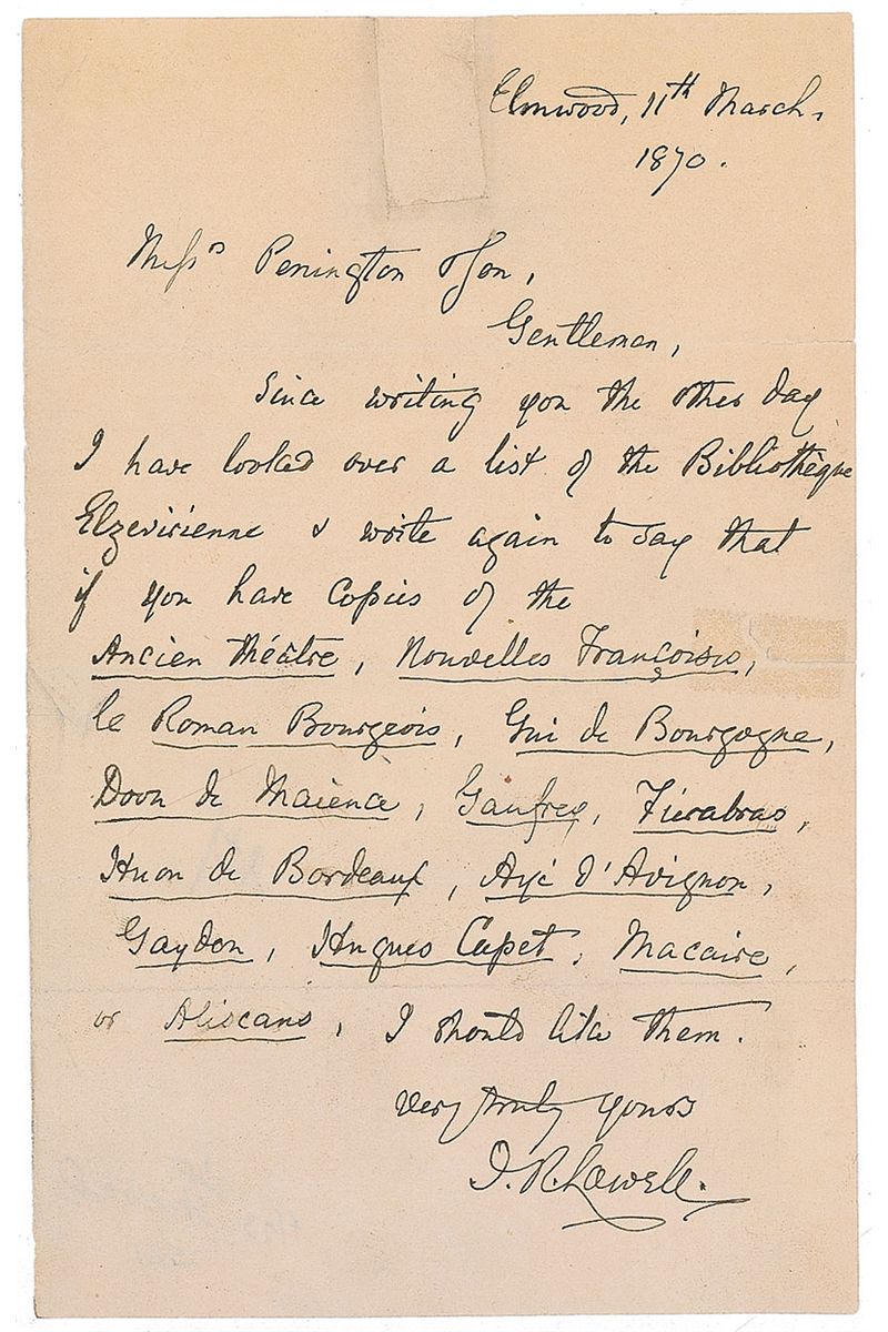 ALS signed “J. R. Lowell,” one page, 4.25 x 6.5, March 11, 1870. Letter to Pennington and Son, Philadelphia booksellers. In part: “I have looked over a list of the Bibliotheque Elzevirienne & write again to say that if you have copies of the Ancien Theatre, Nouvelles Francoise, le Roman Bourgeois, Gui de Bourgogne…Hugues Capet, Macaire, or Aliscans, I should like them.” In very good condition, with an area of professionally repaired paper loss to the top, a few small edge tears (one repaired with tape), and mild toning.