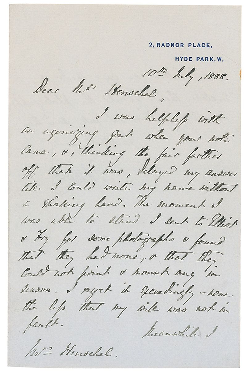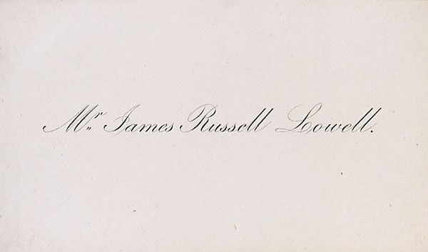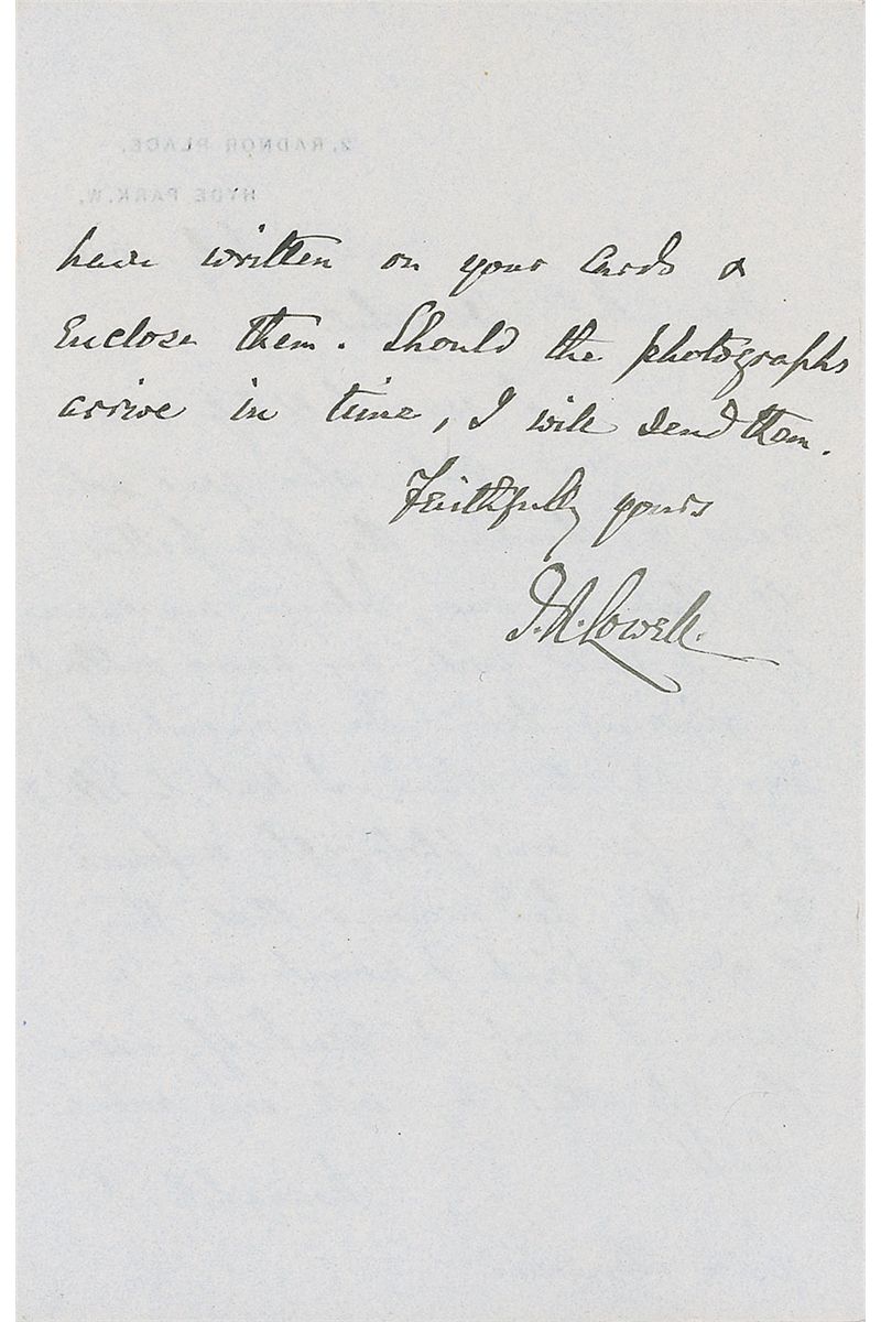American writer and diplomat (1819–1891) who, after a long and successful career as a poet, satirist, and essayist, served as minister to the court of Spain. ALS signed “J. R. Lowell,” one page both sides, 4.5 x 7, personal letterhead, July 10, 1888. Letter to “Mrs. Henschel.” In part: “The moment I was able to stand I sent to Elliot [sic] & Fry for some photographs & found they had none…Should the photographs arrive in time, I will send them.” In fine condition. Accompanied by Lowell’s unsigned personal calling card.