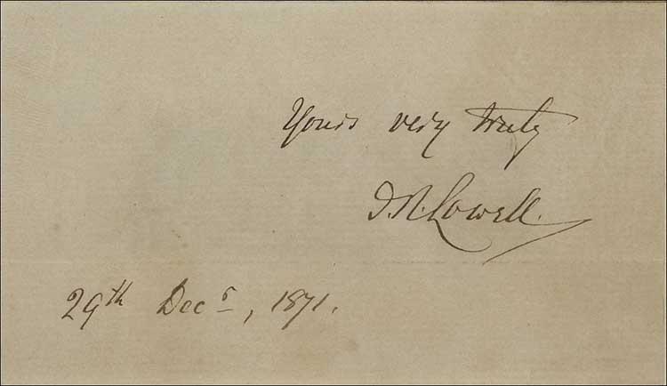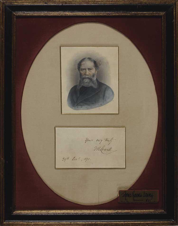 American writer and diplomat (1819–1891) who, after a long and successful career as a poet, satirist, and essayist, served as minister to the court of Spain. Ink signature, “Yours very truly, J. R. Lowell 29th Dec., 1871,” on an off-white 4.5 x 2.75 slip. Slip appears to be affixed to an identical size card. Cloth matted and framed with a color portrait, to an overall size of 11.5 x 14.5. The frame back bears the printed label and red wax seal of noted autograph dealer Charles Hamilton. In fine condition, with a horizontal fold under signature, and a bit of scattered light toning. RRAuction COA.