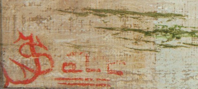 Salt, James (U.K., 1850-1903). "Venice". Ethereal waterway scene with trees and buildings. Oil on canvas. Signed at l.l., "JSalt". In gesso frame with leaf and berry motif. 14" x 18". Frame: 20 3/4" x 24 1/2".