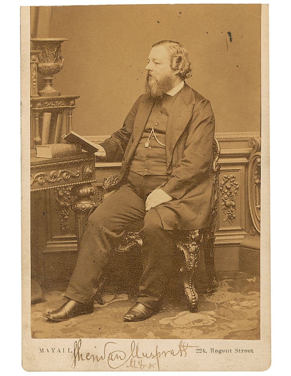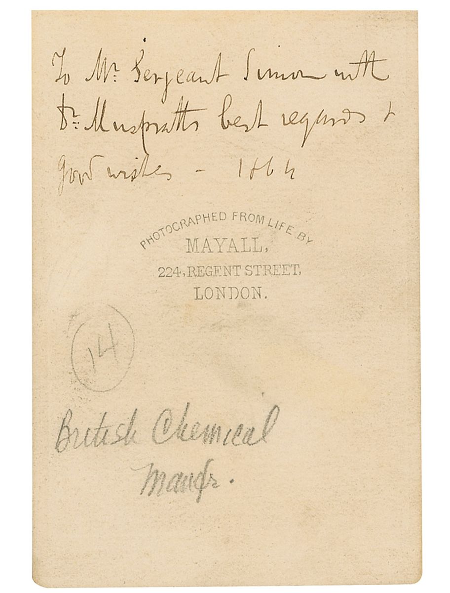 Chemist and teacher (1821–1871) who edited the Dictionary of Chemistry. Original 2.25 x 3.5 carte-de-visite photo by Mayall of London, signed in the lower border in black ink, ”Sheridan Muspratt,” and also inscribed on the reverse, “To Mr. Sergeant Simon with Dr. Muspratt’s best regards and good wishes—1864.” Trimmed top edge and some light soiling and pencil notations to reverse, otherwise fine condition.