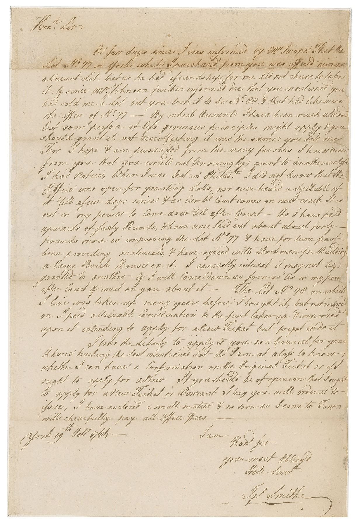 Scarce ALS signed “Jas. Smith,” one page, 8 x 12, October 19, 1764. Written from York, an urgent letter to a gentleman from whom he had recently purchased land, in full: "A few days since I was informed by Mr. Swope that the Lot No. 77 in York which I purchased from you was offered him as a Vacant Lot, but as he had a friendship for me did not chuse to take it, & since Mr. Johnson further informed me that you mentioned you had sold me a Lot but you took it to be No. 88, & that had likewise the offer of No. 77—By which Accounts I have been much alarmed lest some person of less generous principles might apply & you should grant it, not recollecting it was the same you sold me. For I hope & am persuaded from the many favours I have received from you that you would not (knowingly) grant to another unless I had notice. When I was last in Philad'a, I did not know that the Office was open for granting Lotts, nor ever heard a Syllable of it 'till a few days since & as Cumb'd Court comes on next week It is not in my power to come dow 'till after Court—As I have paid upwards of Sixty Pounds, & have since laid out about forty pounds more in improving the Lot No. 77 & have for time past been providing materials, & have agreed with Workmen for Building a large Brik House on it, I earnestly intreat it may not be granted to another & I will come down as soon as 'tis in my power after court & wait on you about it—The Lot No. 78 on which I live was taken up many years before I bought it, but not improved on I paid a Valuable Consideration to the first taker up & improved upon it intending to apply for a New Teiket but forgot to do it. I take the Liberty to apply to you as a Councel for your Advice touching the last mentioned Lot As I am at a loss to know whether I can have a Confirmation on the Original Teiket or it ought to apply for a New. If you should be of opinion that I ought to apply for a New Ticket or Warrant I beg you will order it to issue, I have enclosed a small matter & as soon as I come to Town will chearfully pay all Office Fees." In very good to fine condition, with nearly complete separation along the topmost fold.