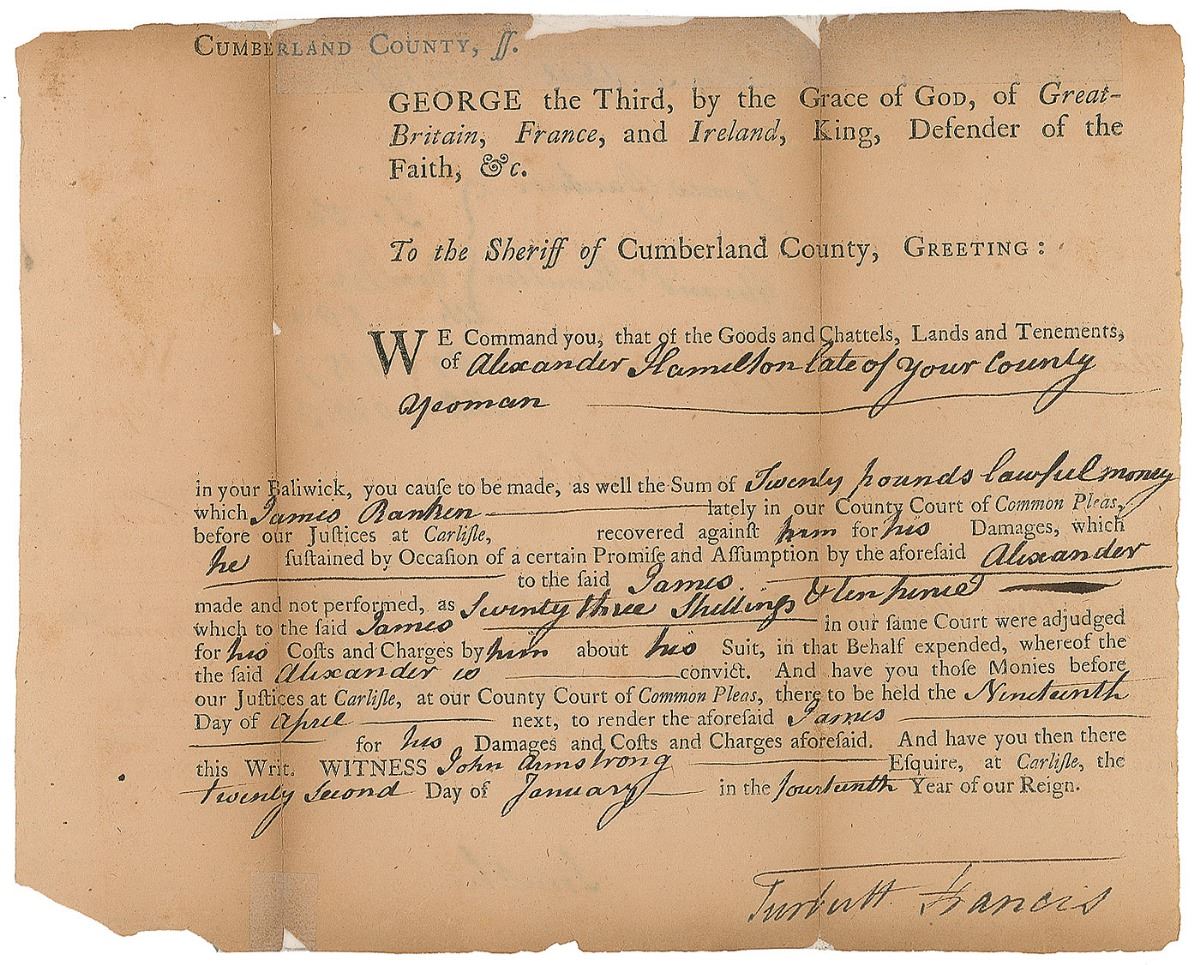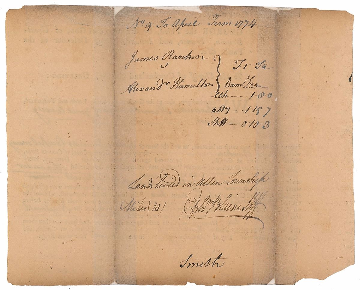 Signer of the Declaration of Independence from Pennsylvania (1719–1806). Partly-printed DS, signed “Smith,” one page, 8.25 x 6.5, January 22, 1774. Cumberland County legal document concerning the case of Alexander Hamilton and James Rankin. Signed on the reverse by Smith. In very good condition, with archival tape reinforcement to separated folds.