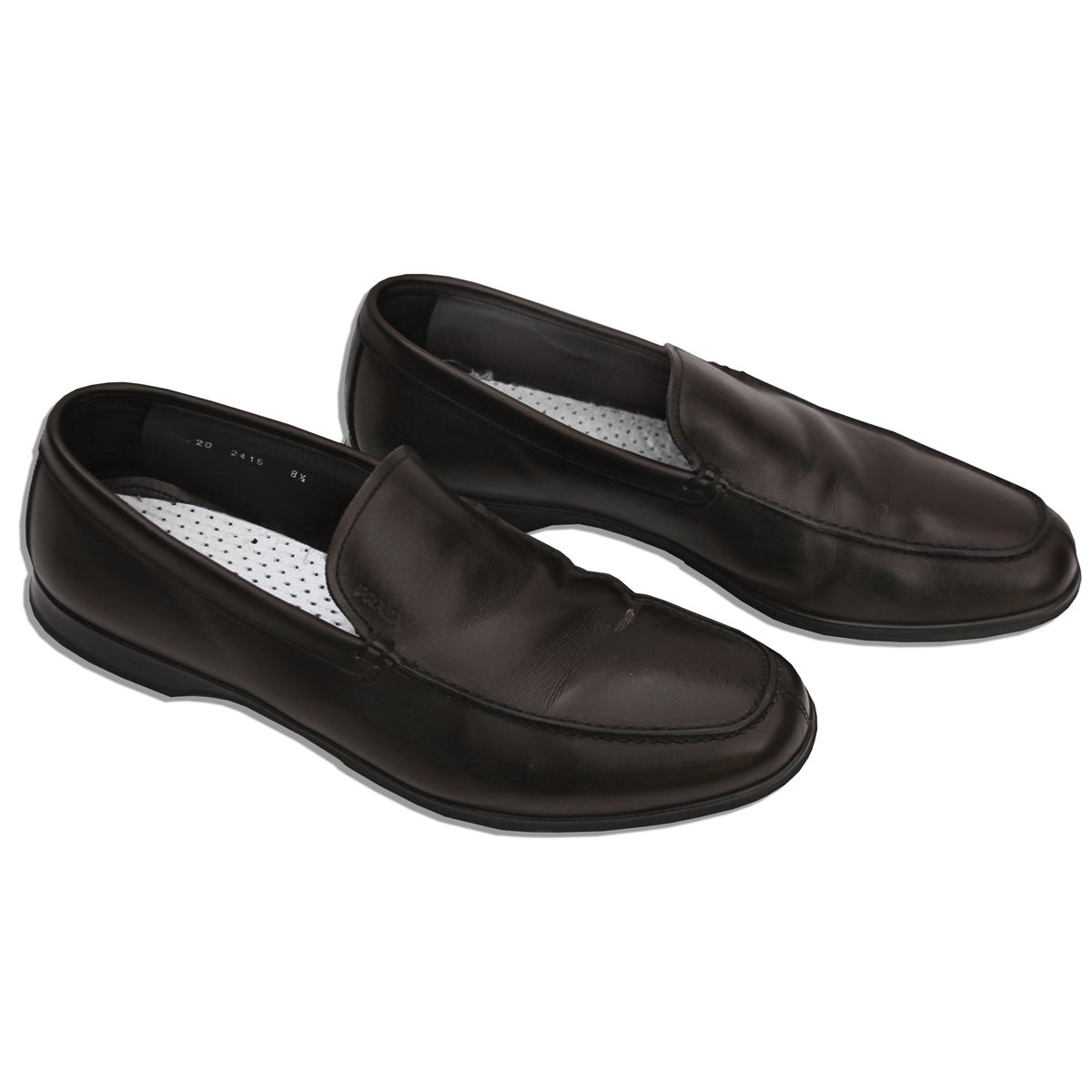 James Spader screen worn shoes from ''The Office''. Emmy award-winning Spader stars on the hit comedy as Robert California. Brown leather loafers by Prada are size 8.5. Each shoe has been slipped into its own navy blue Prada drawstring sack. Pair of shoes are housed in the original box lined in Prada print tissue. Near fine. With a COA from NBC Univeral.