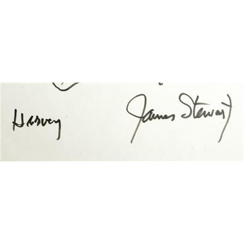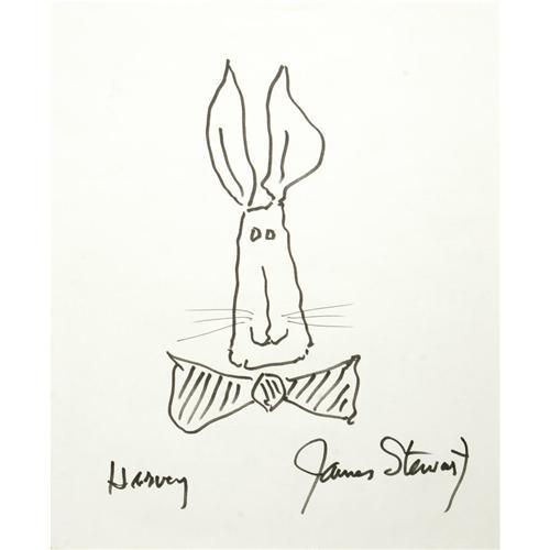 <B>James Stewart Autographed Harvey Sketch.</B></I> One of James Stewart's enduring and endearing performances was as Elwood P. Dowd, loyal and believing friend to <I>Harvey</B></I> (1950). Here's the giant rabbit himself, smiling and sporting a bow tie, as drawn by Stewart in an 11" x 14" black ink sketch. Stewart had written "Harvey" and signed "James Stewart" under the sketch. A wonderfully charming memento of a classic film and its legendary star.<I>Accompanied by LOA from PSA/DNA.</B></I><BR><BR><b>Shipping:</b> Flat Material, Small (<a target="_blank" href="http://www.heritageauctions.com/common/shipping.php">view shipping information</a>)