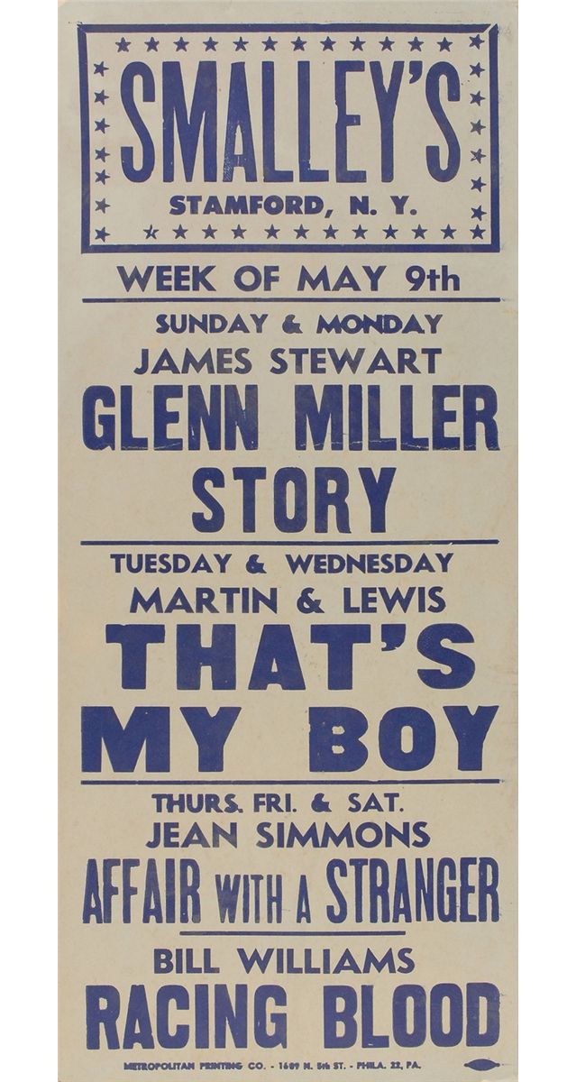 Original window card-style poster, 9.25 x 22, for Smalley’s Stamford Theater in Stamford, New York. Titles listed for the week of May 9 are The Glenn Miller Story starring Stewart, Martin and Lewis in That’s My Boy, and Jean Simmons starring in Affair with a Stranger. In fine condition, with a few edge dings, a light horizontal crease, and a bit of scattered light soiling.