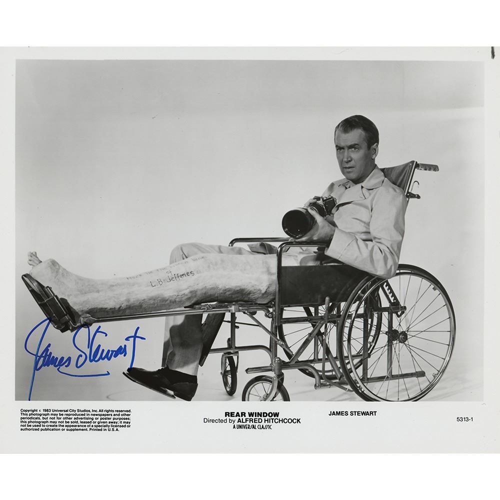 Glossy 10 x 8 Paramount promo photo of James Stewart as L. B. Jefferies in Alfred Hitchock's thriller Rear Window, signed in blue felt tip. In fine condition.