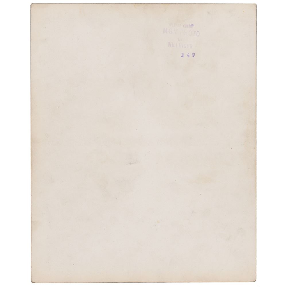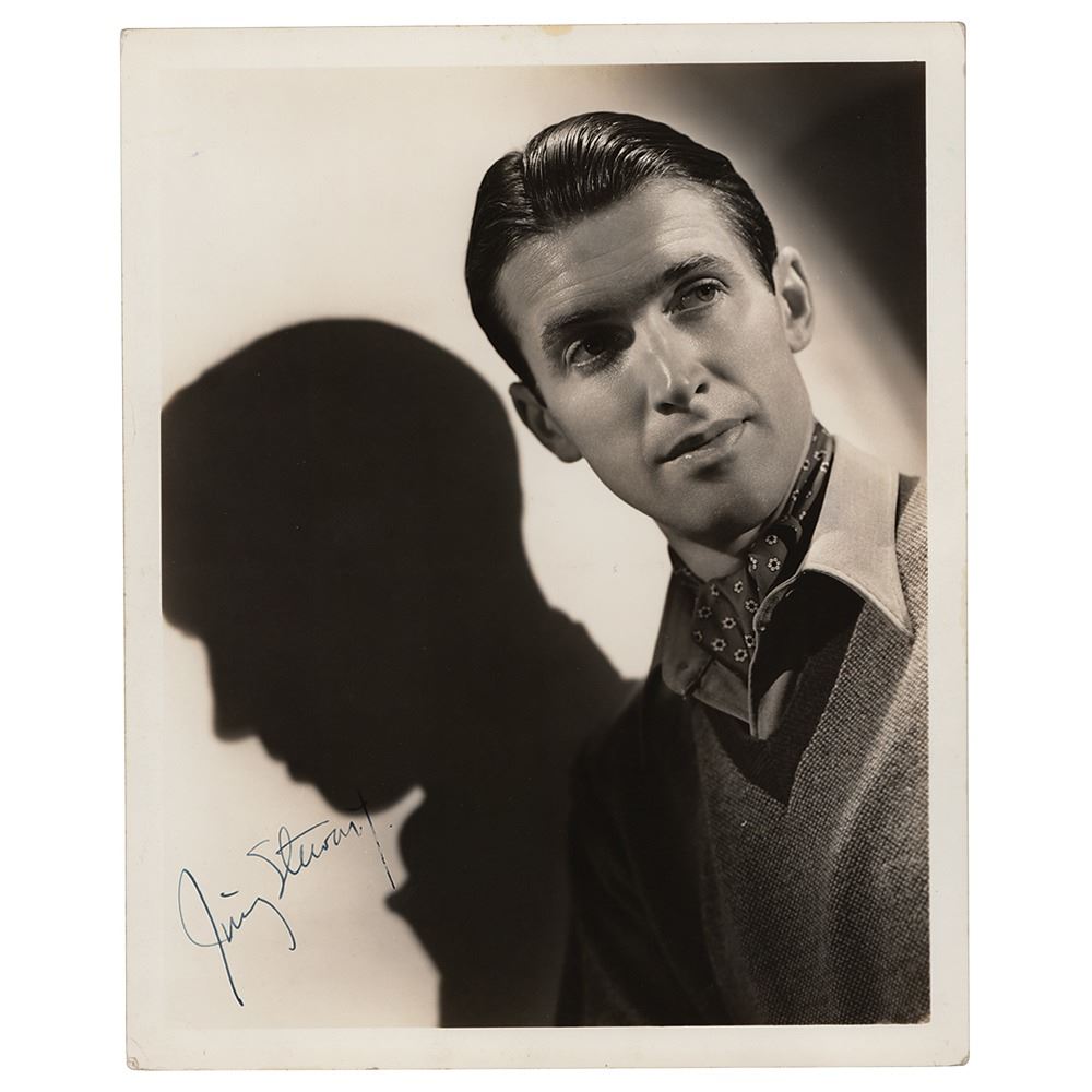Vintage pearl-finish 8 x 10 studio portrait of James Stewart in a handsome early pose, with his shadow cast nicely against the wall behind him, signed in fountain pen. Reverse bears an MGM stamp crediting the photo to Willinger. In fine condition.