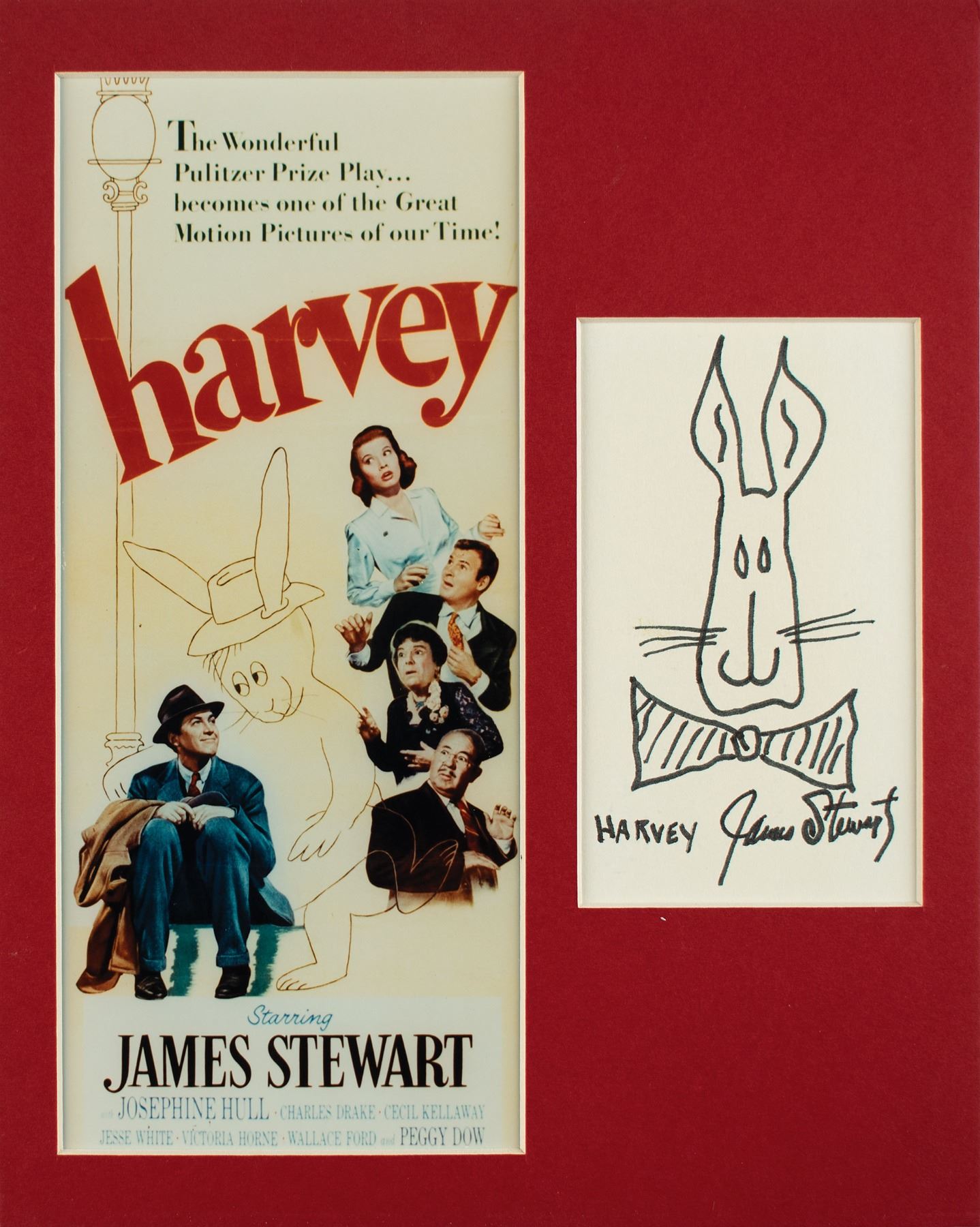 Original felt tip sketch of Harvey the rabbit, accomplished by Stewart on an off-white 2.75 x 4.75 card, signed below, "Harvey, James Stewart." Matted with an image of the movie poster to an overall size of 8 x 10. In fine condition.