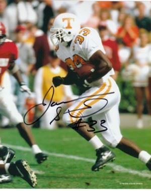 James Stewart was also known as "Little Man," played running back at the University of Tennessee. He wore number 33 while he played at the University of Tennessee and while at the Jaguars. James Stewart has hand autographed this Tennessee Vols 8x10 Photo. Certificate of Authenticity from Athlon Sports.
