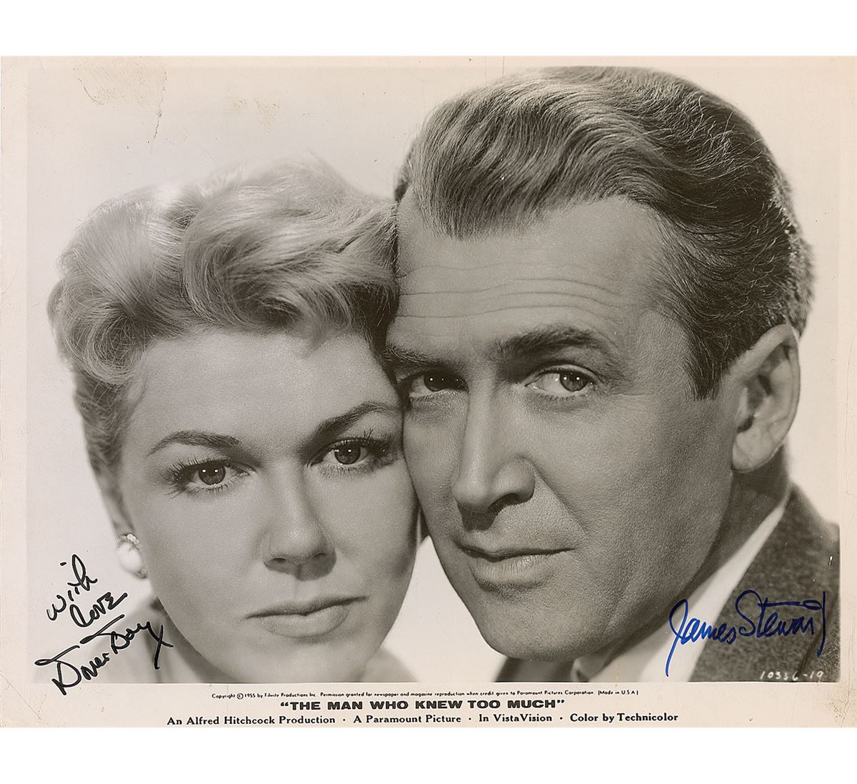 Glossy 10 x 8 Paramount publicity photo of Stewart and Day for the 1956 film The Man Who Knew Too Much, signed in blue felt tip, “James Stewart,” and in black felt tip, “With love, Doris Day.” In very good condition, with scattered creasing (one vertical crease extending from the top edge through Stewart’s forehead), two small edge tears, and some light soiling.